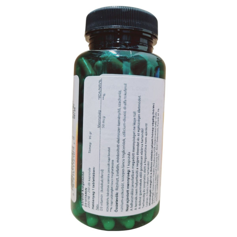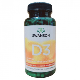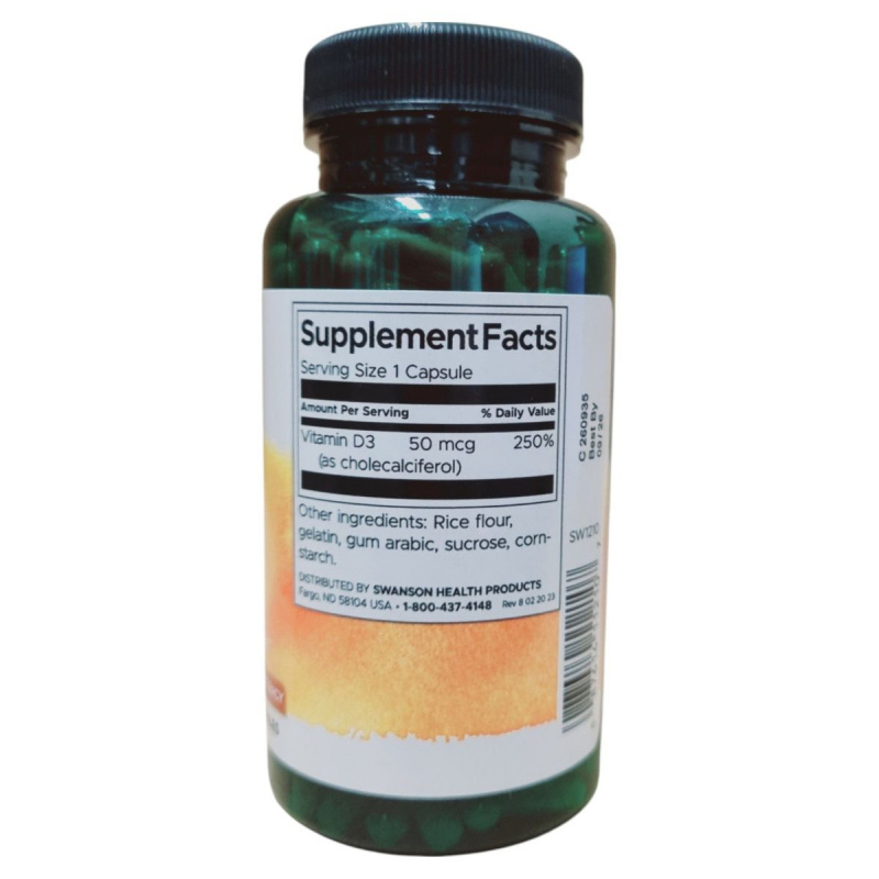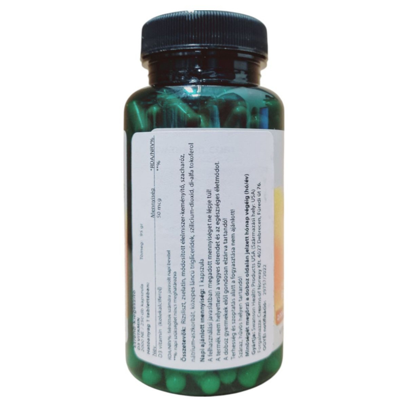 A Swanson Vitamin D3 étrend-kiegészítő kapszula formájában biztosítja a szervezet számára szükséges D-vitamint, amely hozzájárulhat az immunrendszer normál működéséhez és a csontok egészségének fenntartásához. A termék 50 mcg D-vitamint tartalmaz, ami a napi ajánlott bevitel 250%-át fedezi. A kapszula rizslisztet, zselatint, módosított keményítőket és más összetevőket tartalmaz. A termék forgalmazója a Gems of Norway Kft., és az USA-ból származik. Fontos, hogy a terméket gyermekektől elzárva, száraz és hűvös helyen tároljuk, és ne lépjük túl a javasolt napi adagot. A termék nem ajánlott terhesség és szoptatás alatt.