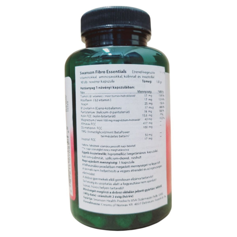A Swanson Fibro Essentials egy komplex étrend-kiegészítő, amely különféle vitaminokat, aminosavakat, kolint és inozitolt tartalmaz. A termék célja, hogy támogassa a szervezet különböző funkcióit, és vegetáriánus kapszulák formájában érhető el. A napi ajánlott mennyiség egy kapszula, amely biztosíthatja a szükséges hatóanyagokat. Fontos, hogy a termék nem helyettesíti a vegyes étrendet és az egészséges életmódot, és terhesség, valamint szoptatás alatt nem ajánlott a fogyasztása. A terméket száraz, hűvös helyen kell tárolni, és gyermekek elől elzárva tartandó.