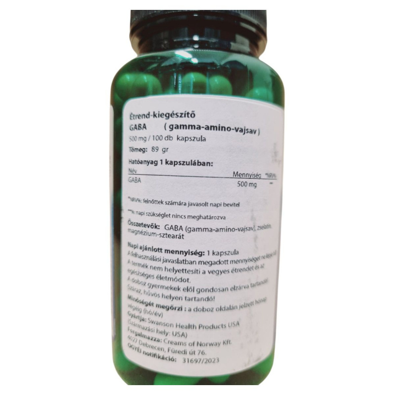 A Swanson GABA étrend-kiegészítő kapszula formájában kínálja a gamma-amino-vajsavat, amely egy fontos neurotranszmitter lehet az idegrendszer számára. A termék napi ajánlott adagja egy kapszula, amely 500 mg GABA-t tartalmaz. Az összetevők között szerepel a zselatin és a magnézium-sztearát is. A termék nem helyettesíti a vegyes étrendet és az egészséges életmódot, és gyermekek elől elzárva tartandó. A Swanson Health Products által gyártott terméket a Creams of Norway Kft. forgalmazza Magyarországon.