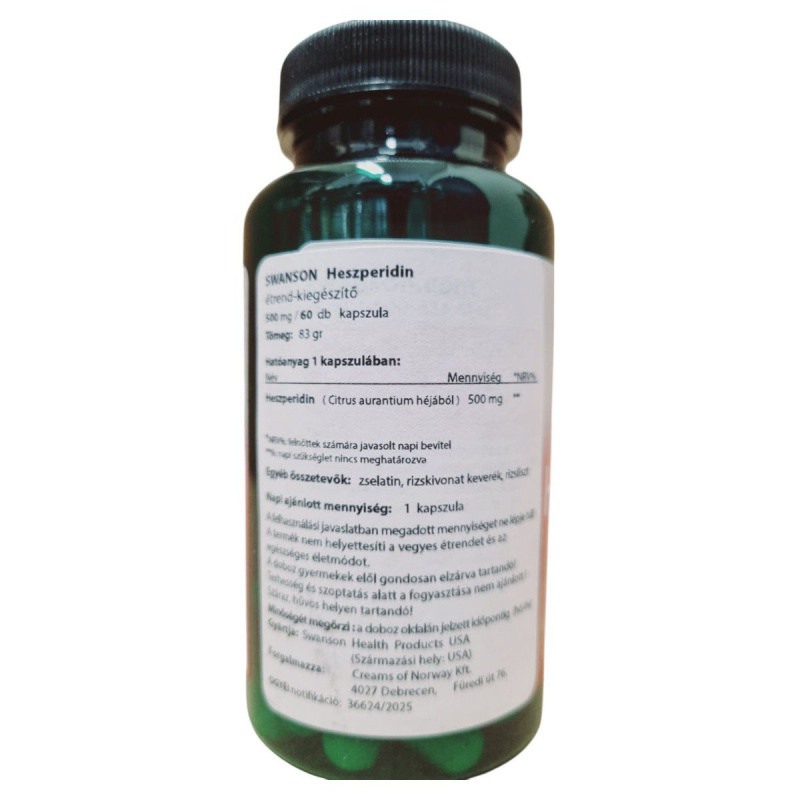 A heszperidin (Hesperidin) egy bioaktív flavonoid glikozid, amely elsősorban citrusfélék (Citrus spp.) héjában található meg. A flavonoidok csoportjába tartozó növényi polifenolként antioxidáns és érfalvédő mechanizmusokon keresztül fejtheti ki hatását. A szervezetben részben aktív metabolitokká alakul, amelyek befolyásolhatják a kapillárisok permeabilitását és a mikrokeringést. Alkalmazása leggyakrabban a vénás keringés támogatására és az oxidatív stressz csökkentésére irányul. Étrend-kiegészítőként gyakran C-vitaminnal kombinálva fordul elő. Általában jól tolerálható, de nagyobb dózisban emésztőrendszeri panaszokat okozhat, ezért alkalmazása körültekintést igényel. Egyéni egészségügyi állapot vagy gyógyszerszedés esetén javasolt szakemberrel konzultálni.