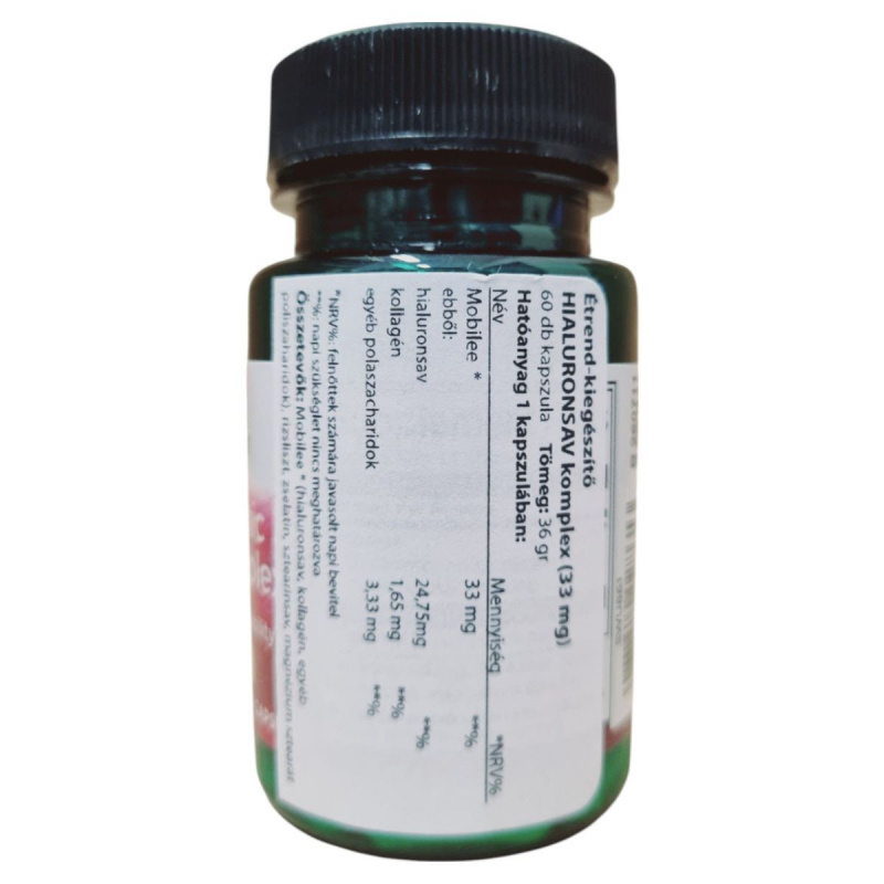 A HIALURONSAV komplex egy étrend-kiegészítő, amely 60 kapszulát tartalmaz. A termék fő hatóanyaga a Mobilee, amely hialuronsavat, kollagént és egyéb poliszacharidokat tartalmaz.