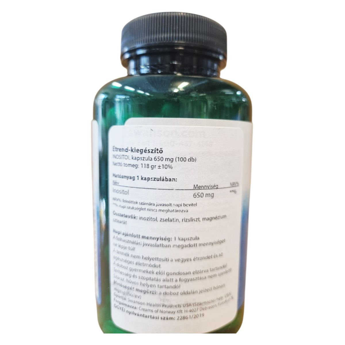 A Swanson Inositol kapszula egy étrend-kiegészítő, amely 650 mg inozitolt tartalmaz kapszulánként. Az inozitol egy fontos tápanyag, amely hozzájárulhat a sejtek egészséges működéséhez és támogathatja a mentális jólétet. A termék összetevői között megtalálható a zselatin, rizsliszt és magnézium-sztearát. Az ajánlott napi mennyiség 1 kapszula, amelyet nem szabad túllépni. A termék nem helyettesíti a vegyes étrendet és az egészséges életmódot, és terhesség vagy szoptatás alatt nem ajánlott a fogyasztása. A terméket száraz, hűvös helyen kell tárolni, és gyermekek elől elzárva tartandó. Az OGYÉI nyilvántartási száma: 22861/2019.