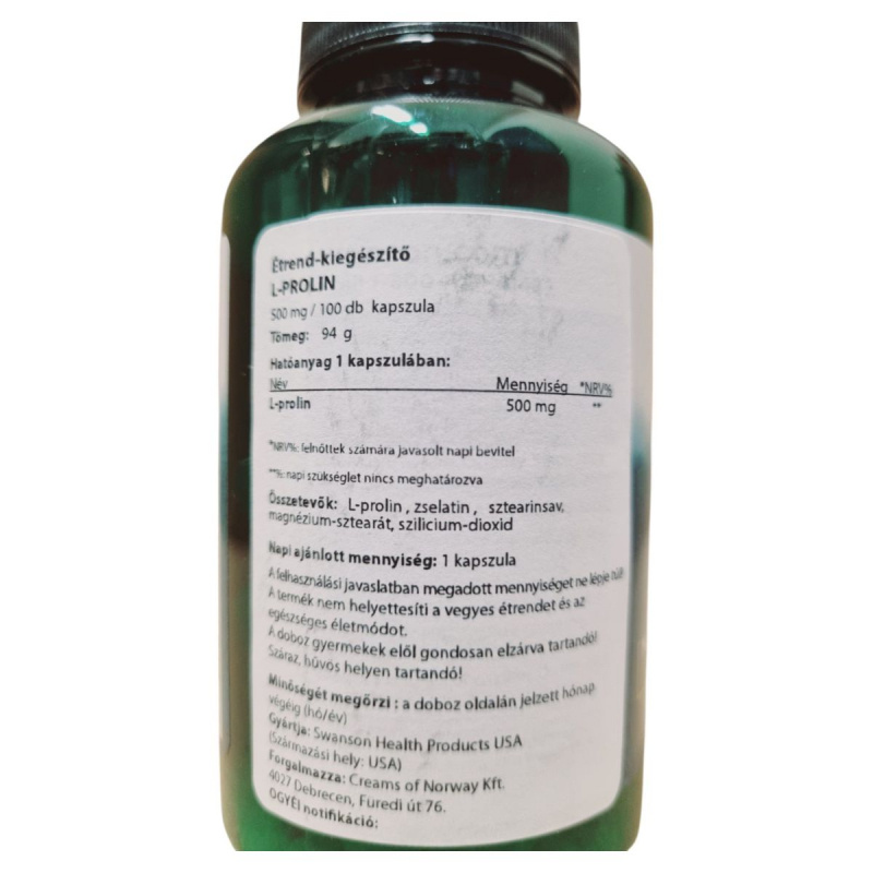 Az L-PROLIN étrend-kiegészítő kapszula 500 mg L-prolint tartalmaz, amely egy fontos aminosav lehet a szervezet számára. A terméket a Swanson Health Products gyártja az USA-ban, és a Creams of Norway Kft. forgalmazza Magyarországon. A kapszulák zselatinból készülnek, és további összetevőket tartalmaznak, mint a sztearinsav, magnézium-sztearát és szilícium-dioxid. Az ajánlott napi adag 1 kapszula, amelyet nem szabad túllépni. A termék nem helyettesíti a változatos étrendet és az egészséges életmódot. Fontos, hogy a dobozt gyermekek elől elzárva, száraz és hűvös helyen tároljuk.