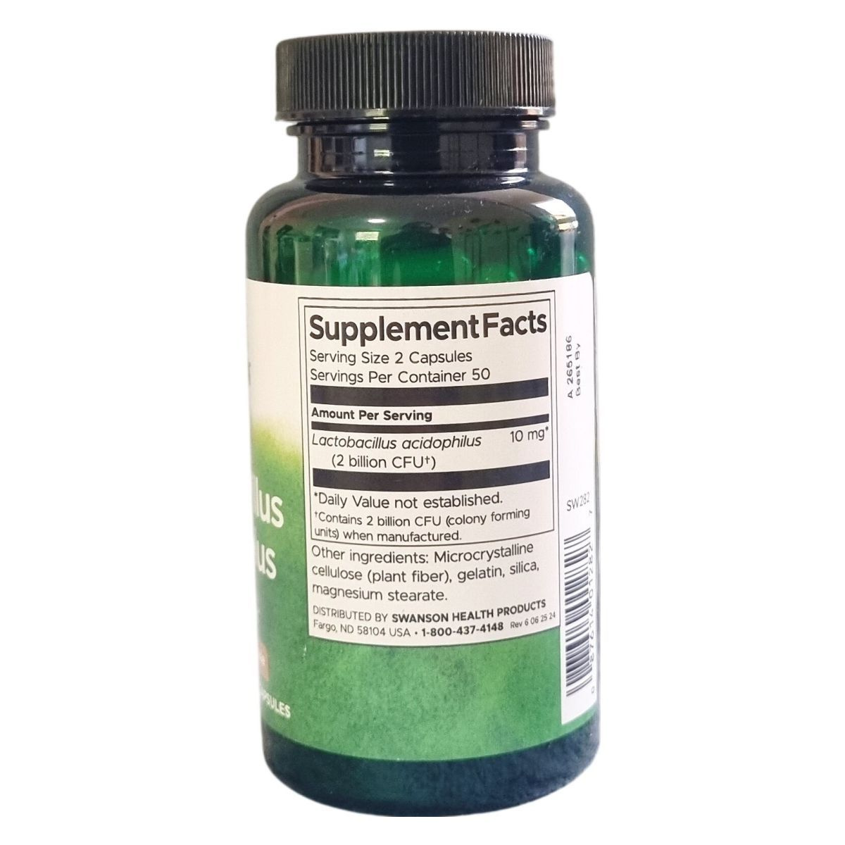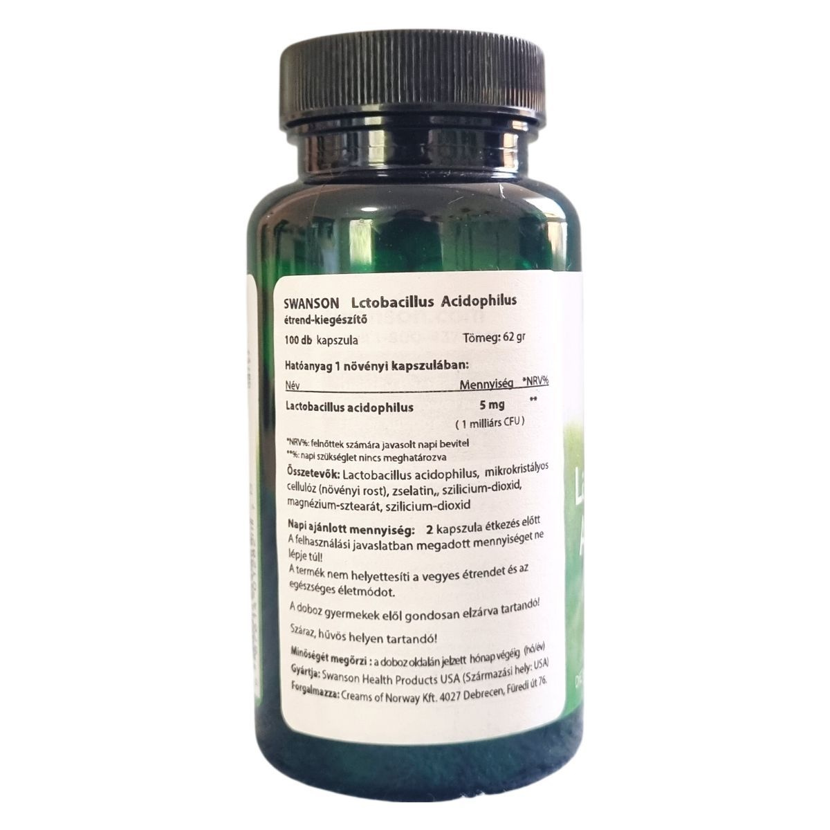 A Swanson Lactobacillus Acidophilus egy étrend-kiegészítő, amely egy növényi kapszulában Lactobacillus acidophilust tartalmaz 1 milliárd CFU-val. Két kapszulában 2 milliárd CFU található, amely a gyártás időpontjában biztosított. A termék mikrokristályos cellulózt, zselatint, szilicium-dioxidot és magnézium-sztearátot is tartalmaz. A csomagolás 100 kapszulát tartalmaz, súlya 62 gramm. A termék az Amerikai Egyesült Államokban készül, forgalmazója a Creams of Norway Kft. Száraz, hűvös környezetben kell tárolni, és gyermekektől gondosan elzárva tartandó. A termék használata a gyártó javaslata szerint naponta 2 kapszula, étkezés előtt. Nem helyettesíti a kiegyensúlyozott étrendet és az egészséges életmódot.