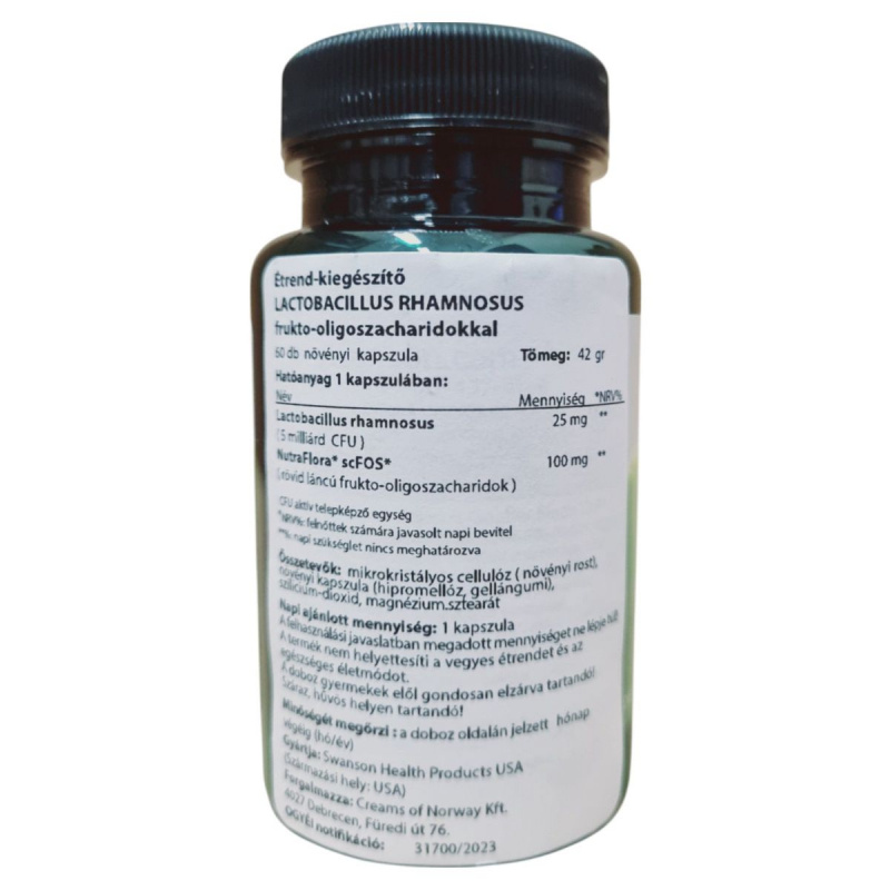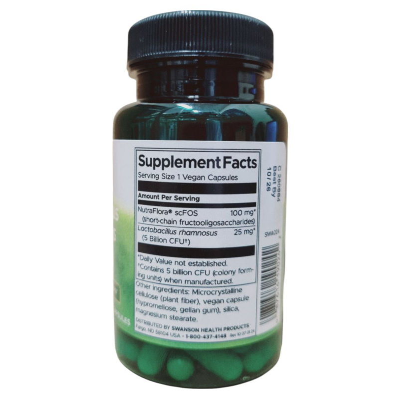 A Swanson Health Products LACTOBACILLUS RHAMNOSUS étrend-kiegészítő 50 db növényi kapszulát tartalmaz, amely Lactobacillus rhamnosus probiotikumot és NutraFlora scFOS frukto-oligoszacharidokat tartalmaz. Ezek az összetevők hozzájárulhatnak az emésztőrendszer egészségének támogatásához. A termék mikrokristályos cellulózból, növényi kapszulából, szilícium-dioxidból és magnézium-sztearátból készül. A napi ajánlott mennyiség 1 kapszula, amelyet nem szabad túllépni. A termék nem helyettesíti a vegyes étrendet és az egészséges életmódot, és gyermekek elől elzárva tartandó. A termék minőségét a doboz oldalán jelzett hónap végéig őrzi meg.