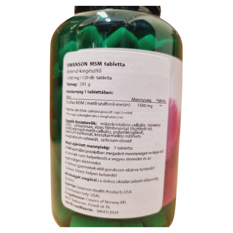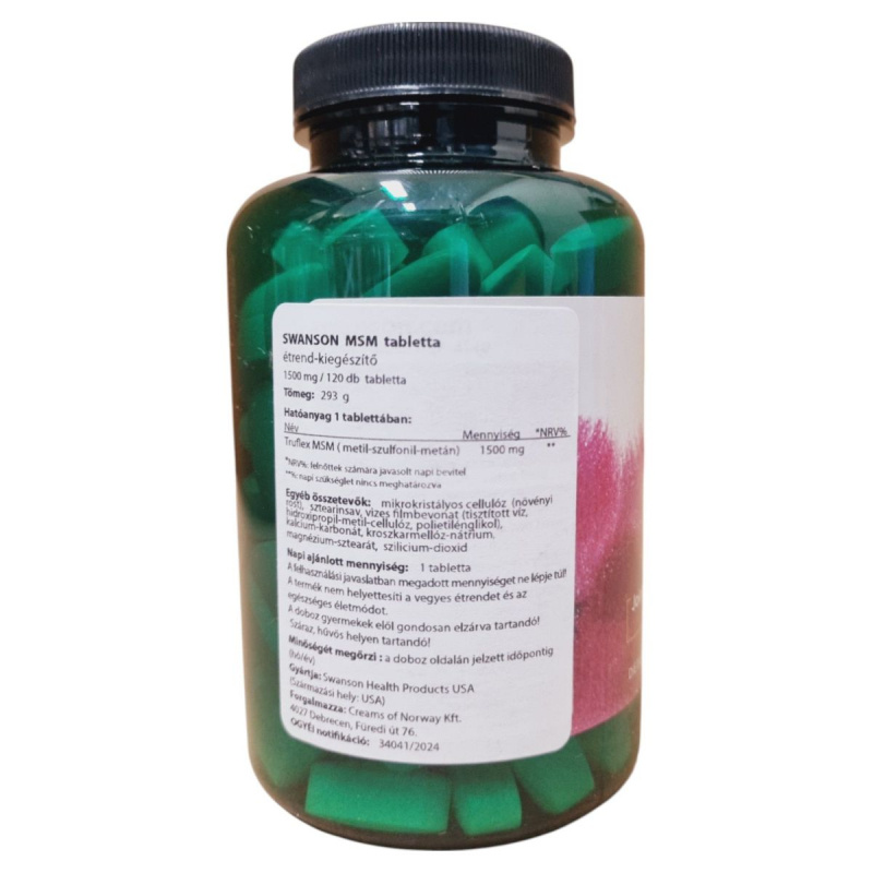A SWANSON MSM tabletta egy étrend-kiegészítő, amely 1500 mg metil-szulfonil-metánt (MSM) tartalmaz tablettánként. Az MSM egy természetes kénforrás, amely hozzájárulhat az ízületek egészségének támogatásához. A termék mikrokristályos cellulózt, sztearinsavat és egyéb segédanyagokat tartalmaz, amelyek segíthetnek a tabletta stabilitásának és hatékonyságának megőrzésében. Az ajánlott napi adag 1 tabletta, amelyet nem szabad túllépni. A termék nem helyettesíti a vegyes étrendet és az egészséges életmódot, és gyermekek elől elzárva tartandó. A Swanson Health Products által gyártott terméket a Creams of Norway Kft. forgalmazza Magyarországon.
