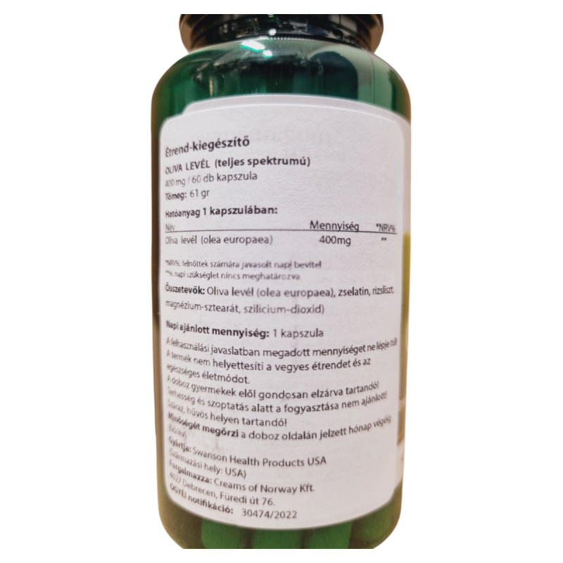 Az Oliva Levél étrend-kiegészítő kapszula 400 mg oliva levél kivonatot tartalmaz, amely természetes módon támogathatja az egészséges életmódot. A termék összetevői között megtalálható a zselatin, rizsliszt, magnézium-sztearát és szilícium-dioxid. A napi ajánlott mennyiség 1 kapszula, amelyet nem szabad túllépni. Fontos, hogy a terméket gyermekek elől elzárva tartsuk, és terhesség vagy szoptatás alatt a fogyasztása nem ajánlott. A termék minőségét száraz, hűvös helyen történő tárolással őrizhetjük meg. A gyártó Swanson Health Products, a forgalmazó pedig a Creams of Norway Kft. Az OGYÉI notifikációs száma 30474/2022.