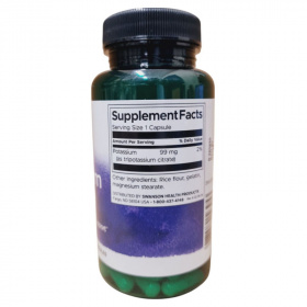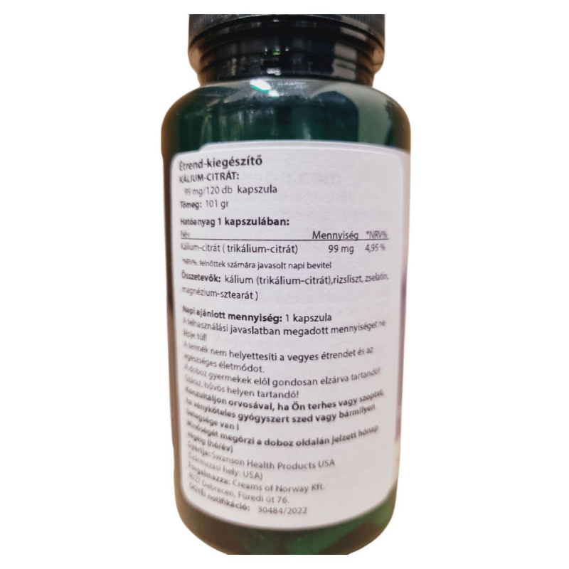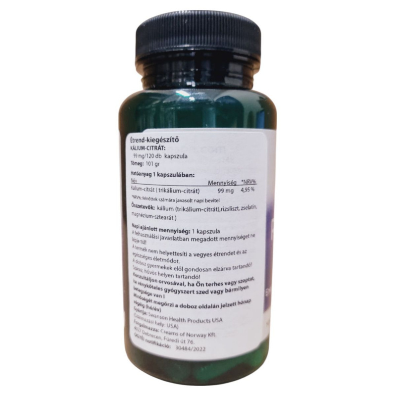 A Swanson Kálium-citrát étrend-kiegészítő kapszula formájában biztosítja a szervezet számára szükséges káliumot, amely hozzájárulhat az idegrendszer és az izomműködés normál működéséhez. A termék 99 mg kálium-citrátot tartalmaz kapszulánként, és a napi ajánlott mennyiség egy kapszula. A termék rizslisztet, zselatint és magnézium-sztearátot is tartalmaz. Fontos, hogy a terméket gyermekek elől elzárva, száraz, hűvös helyen tároljuk. A termék használata előtt konzultáljon orvosával, különösen, ha terhes, szoptat, vényköteles gyógyszert szed vagy bármilyen betegsége van.