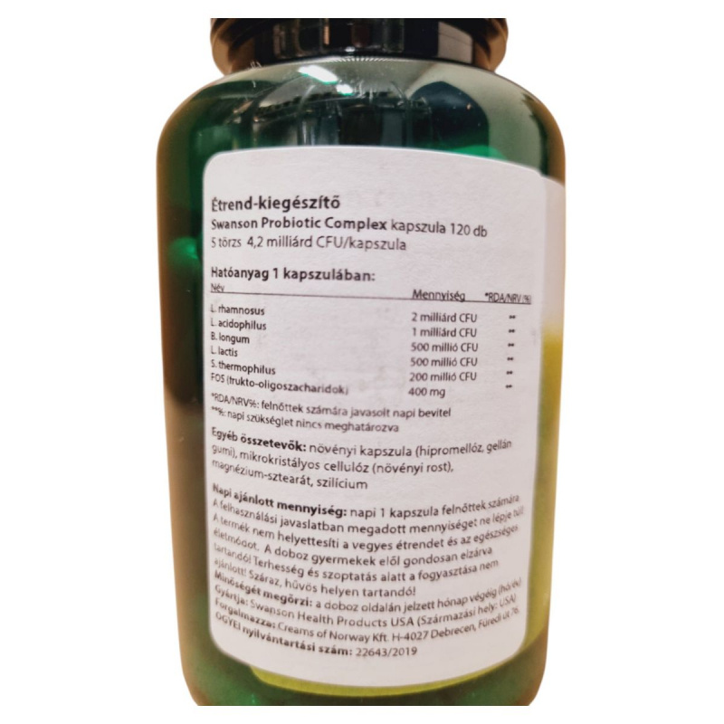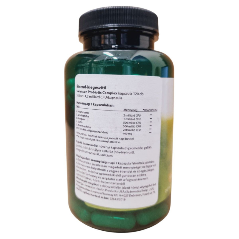 A Swanson Probiotic Complex kapszula öt különböző probiotikus törzset tartalmaz, amelyek összesen 4,2 milliárd CFU-t biztosítanak kapszulánként. Ezek a törzsek, mint például a L. rhamnosus és a L. acidophilus, hozzájárulhatnak az emésztőrendszer egészségének támogatásához. A termék frukto-oligoszacharidokat (FOS) is tartalmaz, amelyek prebiotikumként szolgálhatnak. A kapszulák növényi alapúak, így vegetáriánusok számára is alkalmasak lehetnek. A termék használata során fontos betartani az ajánlott napi mennyiséget, és figyelembe venni a figyelmeztetéseket, különösen terhesség és szoptatás alatt.