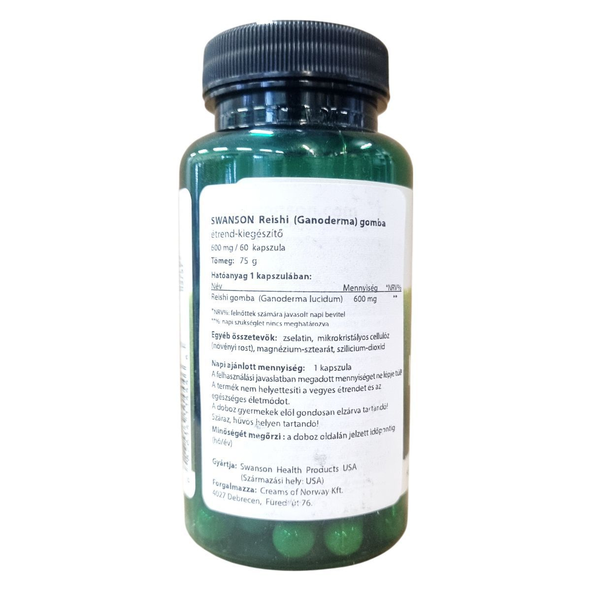 A termék kapszula formában készült, egy kapszula tömege 600 mg aktív hatóanyagot, Reishi gombát (Ganoderma lucidum) tartalmaz. A gomba termőtestét és micéliumát egyaránt felhasználják. A készítmény 60 kapszulát tartalmaz, amelyek össztömege 75 g. A termék származási helye az USA, gyártója a Swanson Health Products. A forgalmazó a Creams of Norway Kft., Debrecen. Az adalékanyagok között zselatin, mikrokristályos cellulóz (növényi rost), magnézium-sztearát és szilícium-dioxid található. A terméket ajánlott gyermekektől elzárva, száraz és hűvös helyen tárolni. A napi adagolást nem szabad túllépni.