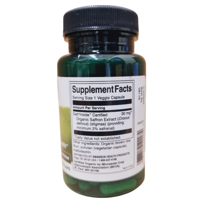 A Swanson Sáfrány Kivonat egy minősített organikus étrend-kiegészítő, amely 60 növényi kapszulát tartalmaz. A termék fő hatóanyaga a Crocus sativus növényből származó sáfrány kivonat, amely minimum 2% safranalt biztosít. Az organikus barna rizsliszt és a vegetáriánus kapszula biztosítja a termék természetes összetételét. A termék használata során fontos, hogy a napi ajánlott mennyiséget ne lépje túl, és terhesség vagy szoptatás alatt kerülje a fogyasztását. A terméket száraz, hűvös helyen kell tárolni, és gyermekek elől elzárva tartani. A Swanson Health Products által gyártott termék forgalmazója a Creams of Norway Kft., Debrecenben.