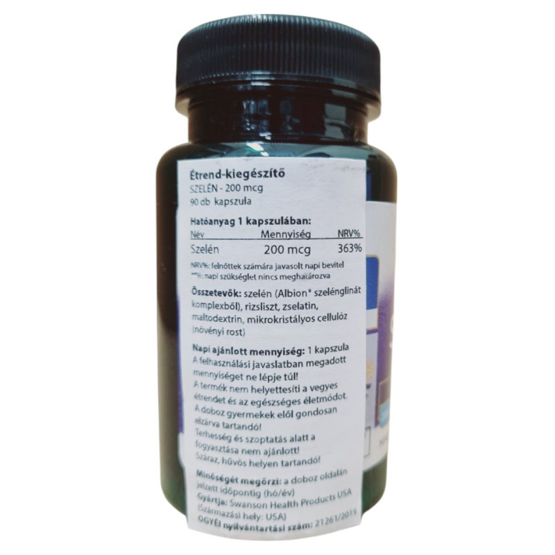 A Swanson Szelén kapszula 200 mcg szelént tartalmaz, amely az Albion szelénglinát komplexből származik. A szelén hozzájárulhat az immunrendszer normál működéséhez és a sejtek oxidatív stresszel szembeni védelméhez. A termék rizslisztet, zselatint, maltodextrint és mikrokristályos cellulózt is tartalmaz. A napi ajánlott mennyiség 1 kapszula, amely a felnőttek számára javasolt napi bevitel 363%-át fedezi. A termék nem helyettesíti a vegyes étrendet és az egészséges életmódot, és terhesség, valamint szoptatás alatt nem ajánlott a fogyasztása. A kapszulákat száraz, hűvös helyen kell tárolni, és gyermekek elől elzárva tartani. A termék az USA-ban készült, és az OGYÉI nyilvántartási száma 21261/2019.
