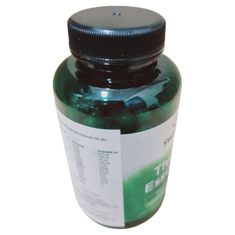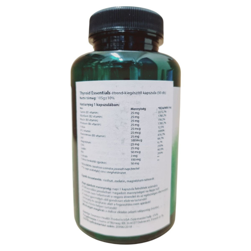 A Thyroid Essentials étrend-kiegészítő kapszula a Swanson Health Products kínálatából származik, és 90 kapszulát tartalmaz. A termék különféle B-vitaminokat, ásványi anyagokat, mint például jód, cink és szelén, valamint növényi kivonatokat tartalmaz, amelyek hozzájárulhatnak a pajzsmirigy egészségének támogatásához. A termék napi ajánlott adagja 1 kapszula, amelyet nem szabad túllépni. A termék nem helyettesíti a vegyes étrendet és az egészséges életmódot, és terhesség, valamint szoptatás alatt nem ajánlott a fogyasztása. A kapszulák rizslisztet, zselatint és magnézium-sztearátot tartalmaznak, és nyomokban tartalmazhatnak rákféléket. A terméket száraz, hűvös helyen kell tárolni, és gyermekek elől elzárva tartani.