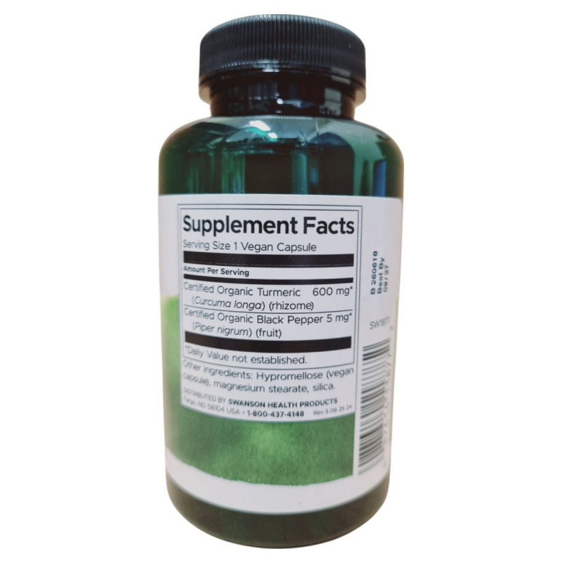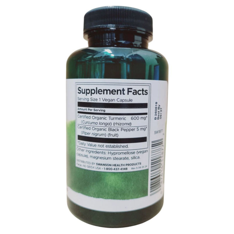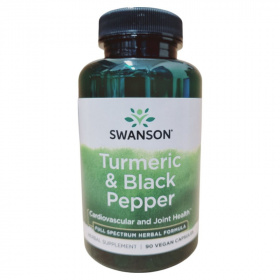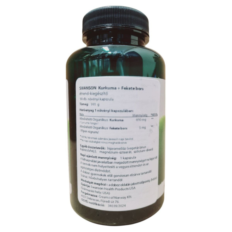A SWANSON Kurkuma + Feketebors étrend-kiegészítő 90 db növényi kapszulát tartalmaz, amely minősített organikus kurkumát és feketeborsot tartalmaz. A termék célja, hogy támogassa az egészséges életmódot, és vegetáriánus étrendbe is beilleszthető. A napi ajánlott mennyiség egy kapszula, amelyet nem szabad túllépni. A termék nem helyettesíti a vegyes étrendet és az egészséges életmódot. A kapszulák összetevői között megtalálható a hipromellóz, a magnézium-sztearát és a szilícium-dioxid. A terméket száraz, hűvös helyen kell tárolni, és gyermekek elől elzárva tartani. A forgalmazó a Creams of Norway Kft., a gyártó pedig a Swanson Health Products.