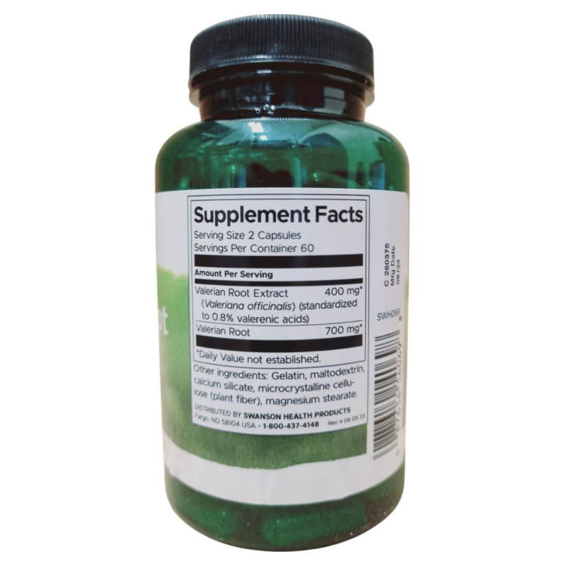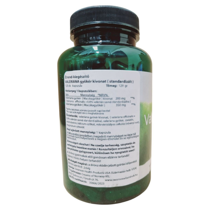 A Swanson VALERIANA gyökér kivonat kapszula egy étrend-kiegészítő, amely valeriana gyökér kivonatot tartalmaz, standardizálva 0,8% valerián savra. A termék célja, hogy támogassa a relaxációt és hozzájáruljon a nyugodt alváshoz. A napi ajánlott mennyiség 1 kapszula, amelyet nem szabad túllépni. A termék álmosságot okozhat, ezért nem ajánlott terhesség, szoptatás alatt, valamint nehézgép kezelése esetén. A terméket száraz, hűvös helyen kell tárolni, és gyermekek elől elzárva tartani. A forgalmazó a Swanson Health Products, a termék származási helye az USA.