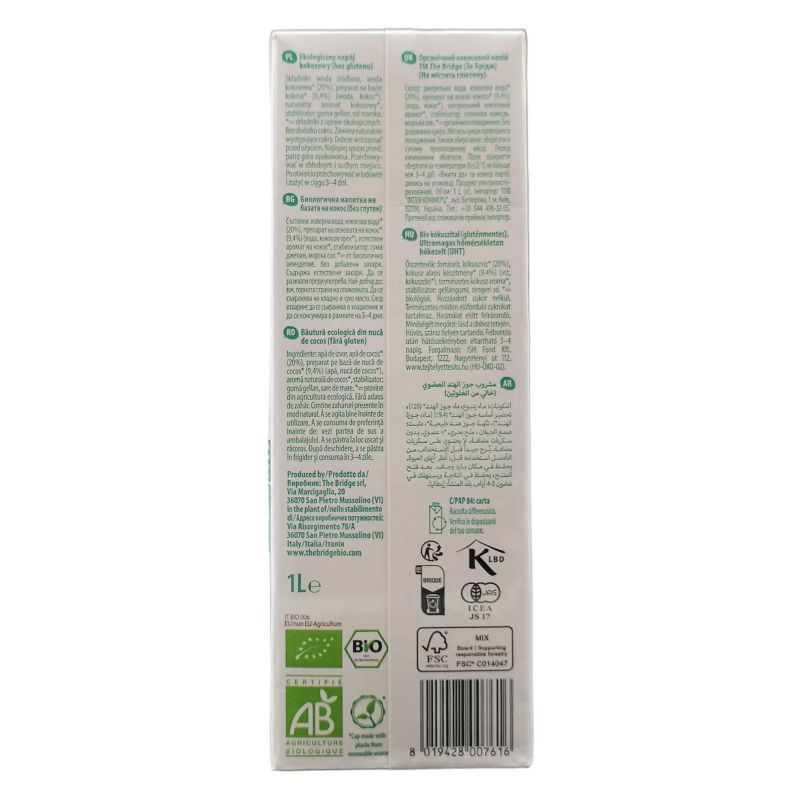 Tápanyag tartalom: Energia 90 kJ, 22 kcal, Zsír 1,8 g, amelyből telített zsírsavak 1,6 g, Szénhidrát 1,0 g, amelyből cukor 0,8 g, Fehérje 0,5 g , Só 0,13 g. Összetevők: Forrásvíz, kókuszvíz(20%) kókusztej* (9,4%) kókuszdió(2,5%)*, víz), természetes kókusz aroma* stabilizátor:gellángumi, só* *=ökológiai. Hozzáadott cukor nélkül. Természetes cukrokat tartalmaz.