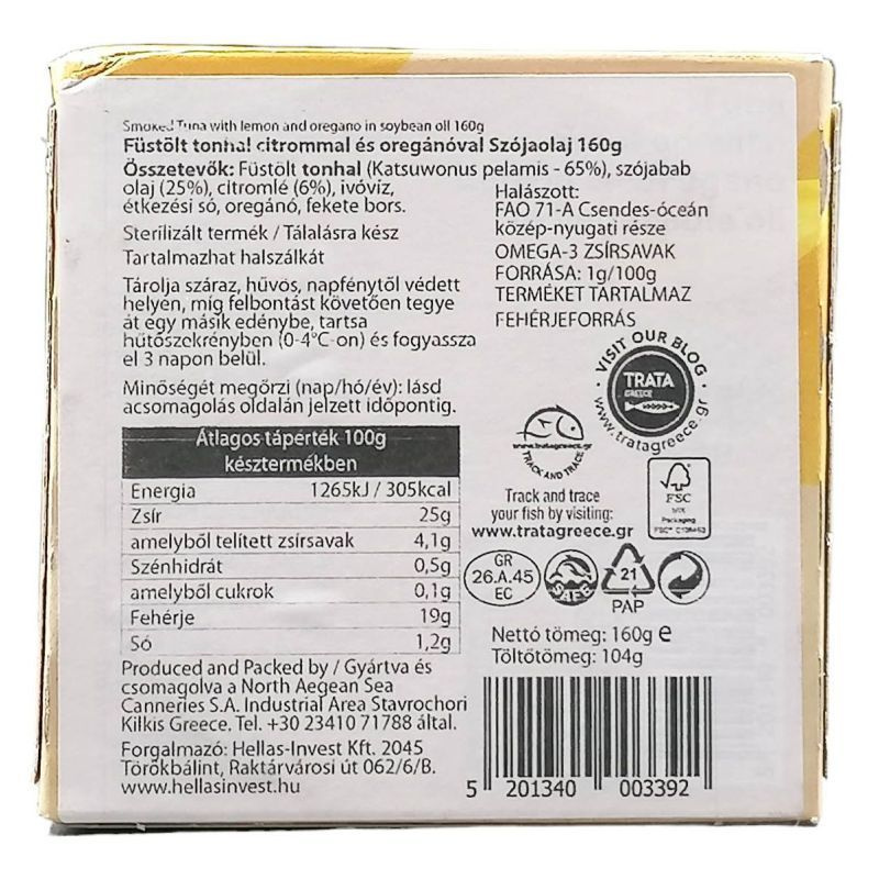 Összetevők: füstölt tonhal, szójaolaj, citromlé, oregánó, só.