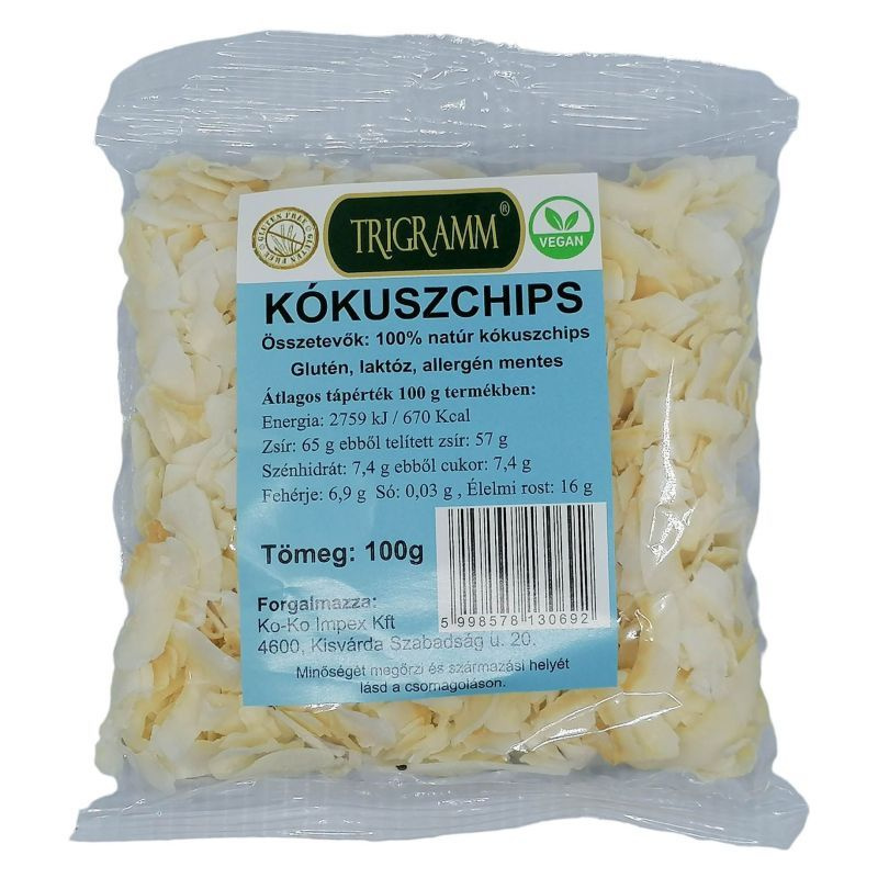 A Trigramm kókuszchips egy ízletes és tápláló snack, amely a kókuszdió friss húsából készült. A termék 100 grammos kiszerelésben kapható, és tökéletes választás mindazok számára, akik egészséges alternatívát keresnek a hagyományos nassolnivalók helyett. A kókuszchips ropogós állaga és természetes íze miatt ideális kiegészítője lehet a reggeli müzliknek, joghurtoknak vagy smoothie-knak, de önálló snackként is élvezhető. A kókusz gazdag tápanyagokban, például rostokban és egészséges zsírokban, így hozzájárulhat a kiegyensúlyozott táplálkozáshoz. A termék laktózmentes, gluténmentes, vegán és paleo diétába is beilleszthető, így széles körben fogyasztható, függetlenül az étrendi korlátozásoktól.