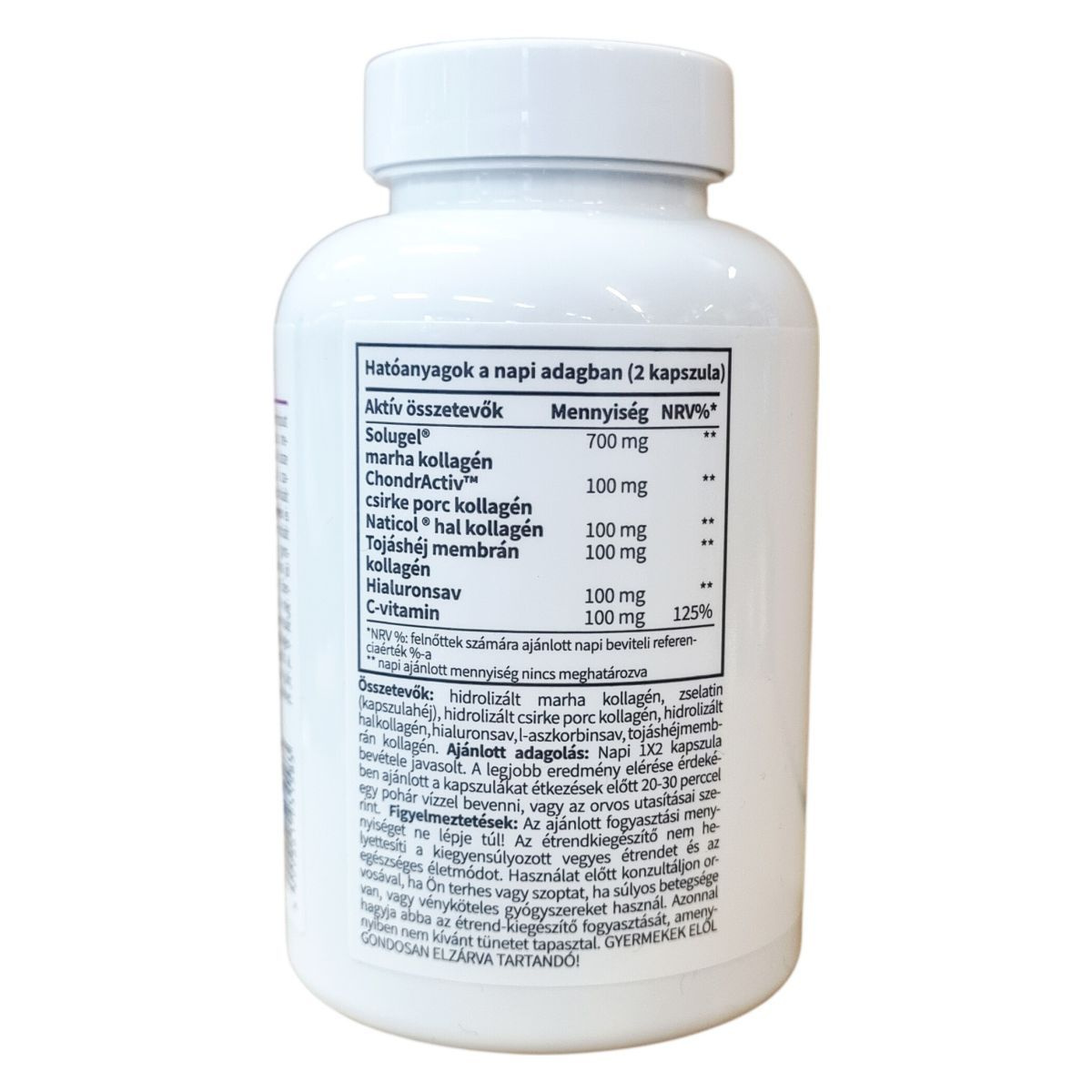 hidrolizált marha kollagén, zselatin (kapszulahéj), hidrolizált csirke porc kollagén, hidrolizált hal kollagén, hialuronsav, L-aszkorbinsav, tojás kollagén