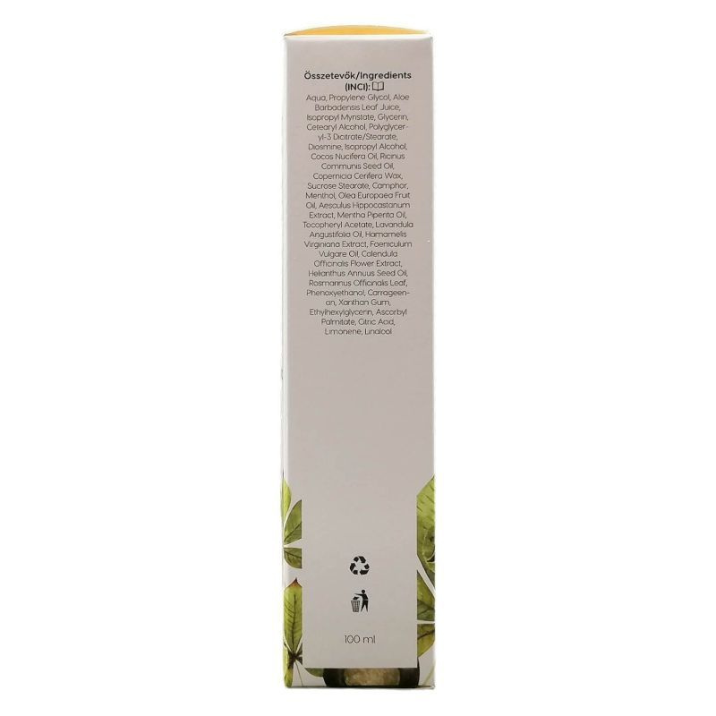 Összetevők: Aqua, Propylene Glycol, Aloe Barbadensis Leaf Juice, Isopropyl Myristate, Glycerin, Cetearyl Alcohol, Polyglyceryl-3 Dicitrate/Stearate, Diosmine, Isopropyl Alcohol, Cocos Nucifera Oil, Ricinus Communis Seed Oil, Copernicia Cerifera Wax, Sucrose Stearate, Camphor, Menthol, Olea Europaea Fruit Oil, Aesculus Hippocastanum Extract, Mentha Piperita Oil, Tocopheryl Acetate, Lavandula Angustifolia Oil, Hamamelis Virginiana Extract, Foeniculum Vulgare Oil, Calendula Officinalis Flower Extract, Helianthus Annuus Seed Oil, Rosmarinus Officinalis Leaf, Phenoxyethanol, Carrageenan, Xanthan Gum, Ethylhexylglycerin, Ascorbyl Palmitate, Citric Acid, Limonene, Linalool.