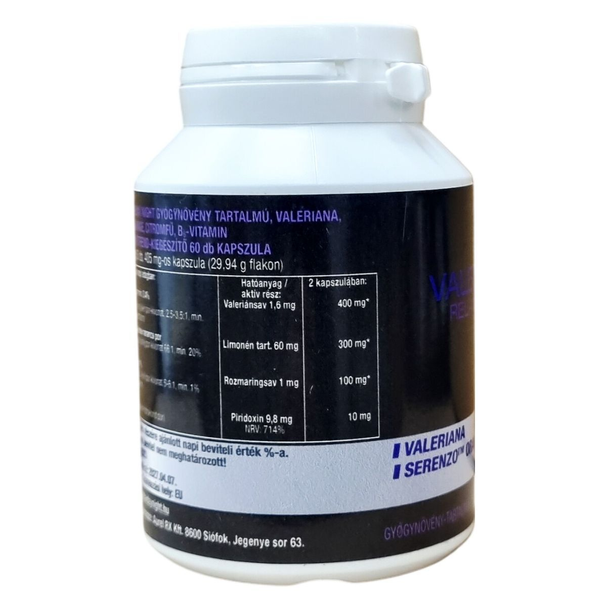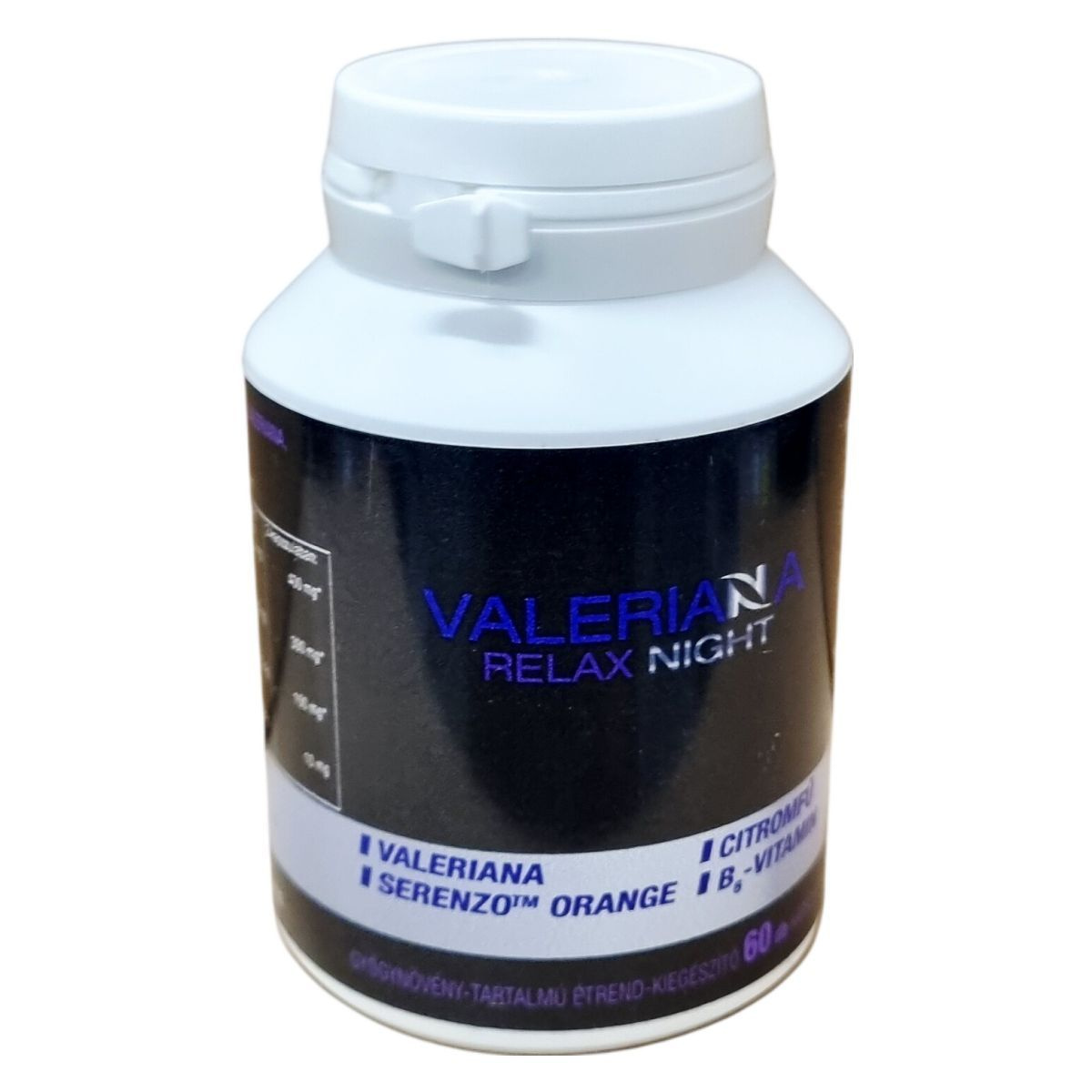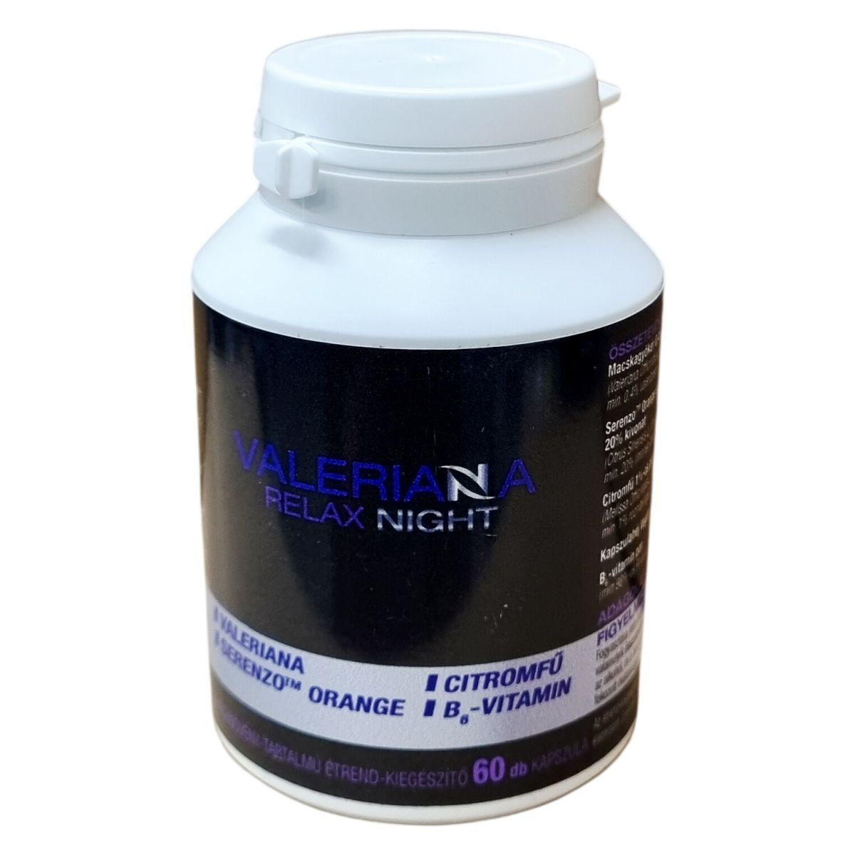 A Valeriana Relax Night egy gyógynövény-tartalmú étrend-kiegészítő, amely macskagyökér kivonatot, Serenzo Orange édes narancs por kivonatot, citromfű por kivonatot és B6-vitamint tartalmaz. A kapszula készítése vegán cellulózhéjban történik. A termék összetevői között a macskagyökér 0,4%-os valeránsav tartalommal, a Serenzo Orange citrushéj porének 20% limonén tartalommal, a citromfű por 1% rozmaringsav tartalommal, a B-vitamin pedig minimum 98%-os piridoxin-hidroklorid por formájában fordul elő. A termék EU-ból származik és vegan minősítéssel rendelkezik. Fogyasztása javasolt felnőtteknek, azonban várandós és szoptató kismamák, kisgyermekek, valamint összetevőkre allergiás vagy érzékeny személyek számára nem ajánlott. A termék fokozhatja az alkohol és a benzodiazepinek nyugtató hatását, ezért gépjárművezetés vagy fokozott figyelmet igénylő tevékenységek esetén körültekintően használandó. Az ajánlott napi adagot nem szabad túllépni.