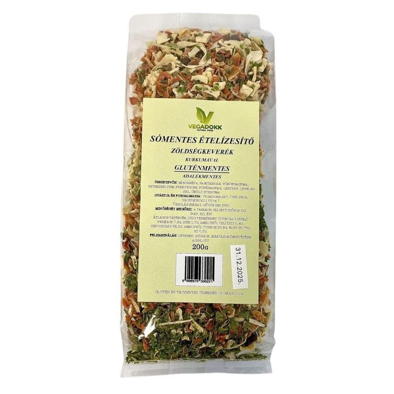 Összetevők: sárgarépa, paszternák, vöröshagyma , petrezselyem, feketebors, póréhagyma, lestyán, leveles kel, kurkuma. Glutén és tejmentes üzemben csomagolva!