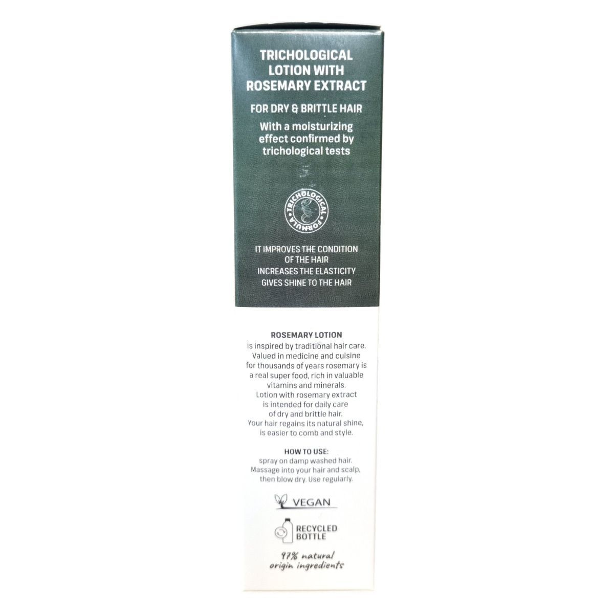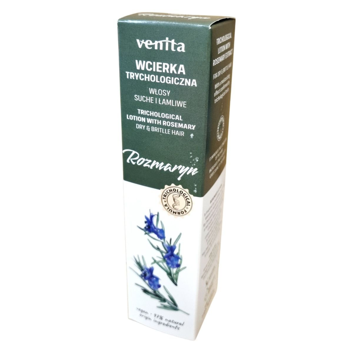A Venita Trichological Lotion rozmaring kivonattal készült, kifejezetten száraz és töredezett hajra. A termék formulája trichológiai tesztekkel igazolt hidratáló hatással rendelkezik. Rendszeres használata javíthatja a haj állapotát, növelheti rugalmasságát és természetes fényt adhat. A rozmaring tradicionális gyógynövény, melyet évezredek óta használnak a hajápolásban; vitaminokban és ásványi anyagokban gazdag. A hajszesz újrahasznosított palackban kerül forgalomba, környezettudatos, vegán formulával. A haj könnyebben kifésülhetővé és formázhatóvá válhat, miközben a természetes szépségét is megőrzi.