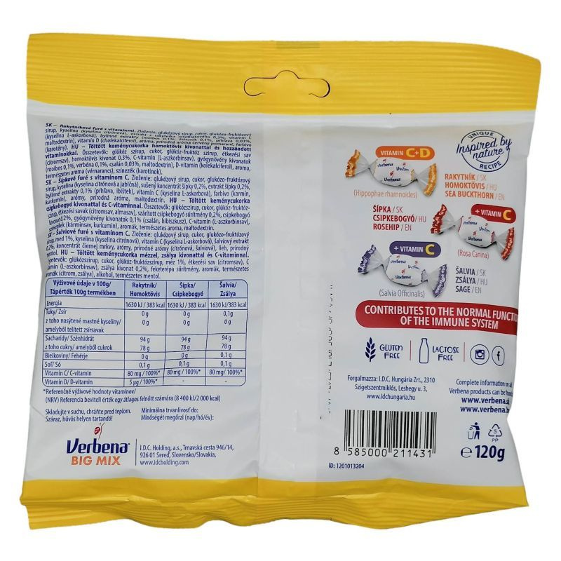 cukor, glükózszirup, gyógynövénykivonatok (homoktövis, csipkebogyó, zsálya), savanyúságot szabályozó anyag: citromsav, aroma, természetes aroma, feketerépa sűrítmény, vitaminok (C-vitamin, D-vitamin), színezékek (kurkumin, paprika kivonat, klorofillin)