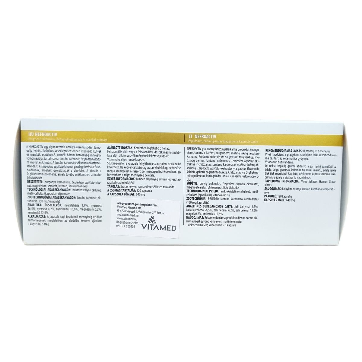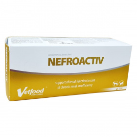 A NEFROACTIV egy olyan termék, amely a veseműködést támogatja felnőtt, krónikus veseelégtelenségben szenvedő kutyák és macskák esetében. A termék három hatóanyag innovatív kombinációját tartalmazza: lantán-karbonátot, Lespedeza capitata kivonatot és kitozánt. A lantán-karbonát csökkenti a foszfátfelszívódást. A Lespedeza capitata kivonat gazdag forrása a flavonoidoknak, amelyek gyorsíthatják a diurézist. A kitozán a D-glükózamin polimerje, amely tovább csökkentheti a foszfor felszívódását. Szükség esetén a kapszula felnyitható és a tartalma az eledelbe keverhető. Ha kedvence kizárólag száraz eledelt kap, nedvesítse meg a szemcséket a rászórt por megtapadása érdekében, így biztosítható a teljes mennyiség bevétele. A kapszula tömege: 640 mg. Technológiai adalékanyagok: mikrokristályos cellulóz, metil-cellulóz (kapszula), citromsav. Zootechnológiai adalékanyagok: lantán-karbonát-oktahidrát (150 mg/kapszula).