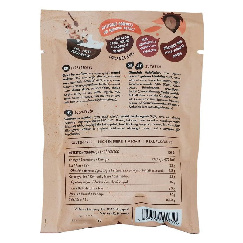 Összetevők: Gluténmentes zabpehely, agavé szirup, törökmogyoró 11%, étcsokoládé 6% (kakaó, kakaóvaj, nyers nádcukor, napraforgó lecitin), napraforgómag, kókuszvirág nektár, extra szűz olívaolaj, tökmag, kókuszpehely, mandula, só, fahéj, fűszerek.