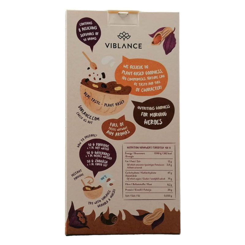 Összetevők: Gluténmentes zabpehely, őrölt pirított földimogyoró 13%, datolyapüré, datolyakocka, borsófehérje, kakaópor 4%, földi mandula, napraforgómag, puffasztott quinoa* Pörkölt földimogyoró és kakaó krémes keveréke, egy csomó szuperélelmiszerrel, amik segítenek abban, hogy evés közben egyensúlyba kerülj önmagaddal és a világgal… Felejtsd el a kellemetlen ízű sportporokat, gondoskodj a megfelelő fehérjebevitelről egy krémesen finom zabkásával- reggelire vagy edzés után!