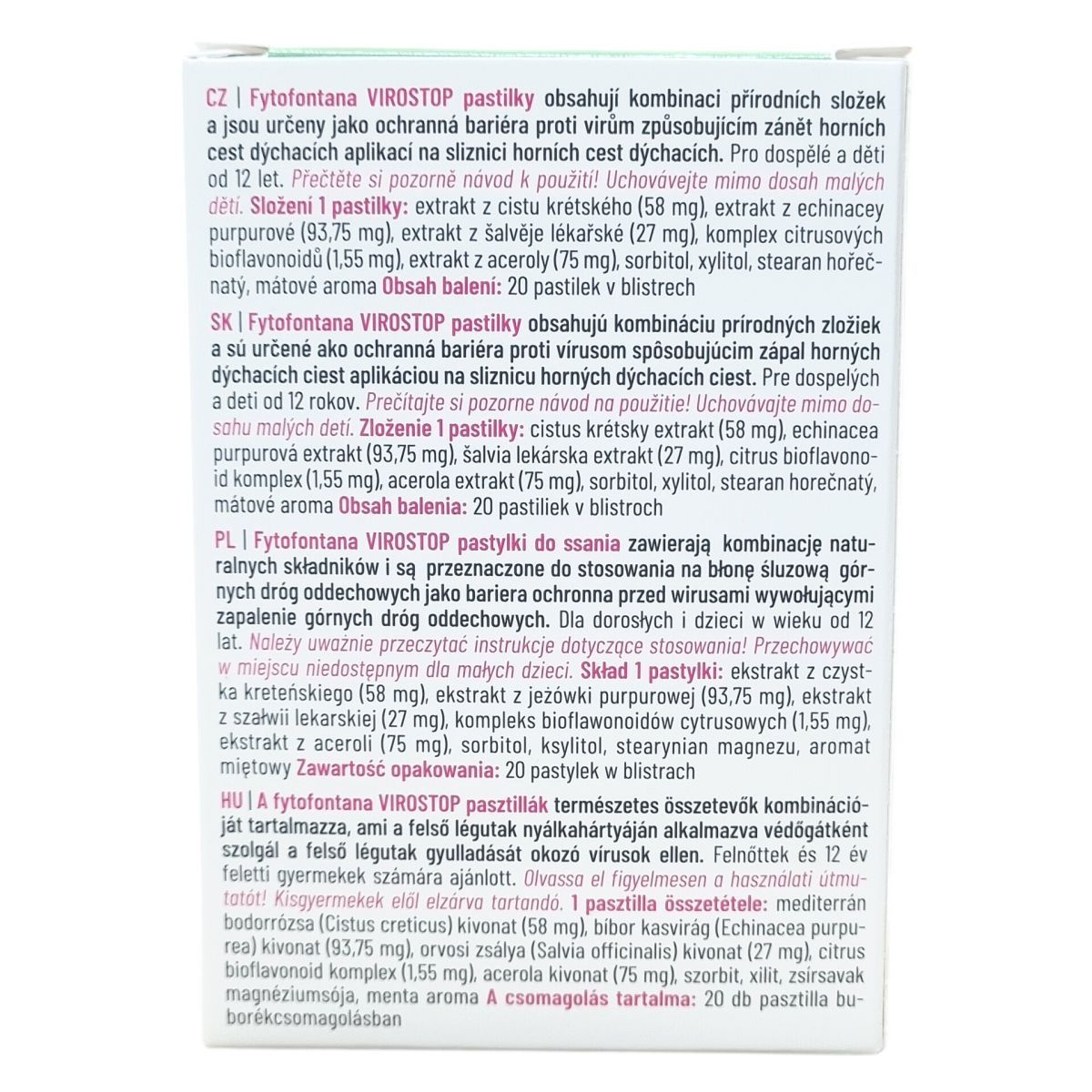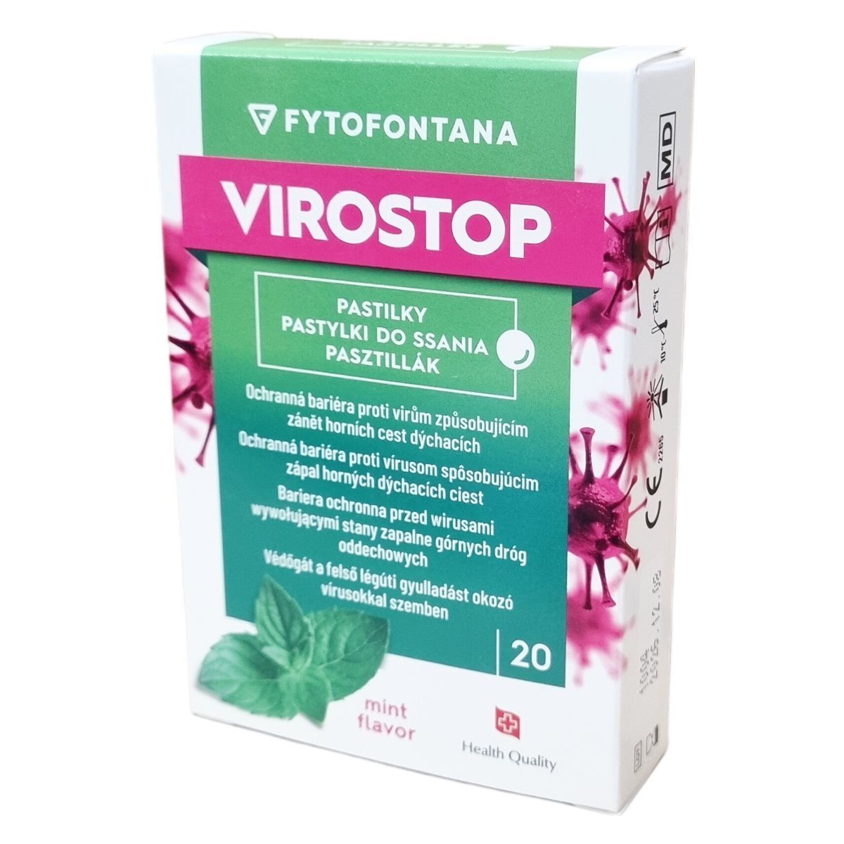 A Fytofontana VIROSTOP pasztillák alkalmazása a felső légutak nyálkahártyáján történik, és védőgátként szolgálhatnak a vírusok okozta gyulladások ellen. A termék természetes alapanyagokból készül, melyek között megtalálható a mediterrán bodorrózsa, bíbor kasvirág, orvosi zsálya, citrus bioflavonoid komplex és acerola kivonat. A csomagolás 20 pasztillát tartalmaz bliszterben. A termék ízesített, mentás aroma segítheti a kellemes használatot. Különösen felnőttek és 12 éven felüli gyermekek számára ajánlott. A pasztillákat kisgyermekektől elzárva kell tárolni, és a felhasználás előtt ajánlott elolvasni a használati útmutatót. A tárolási hőmérséklet 10 és 25 °C között optimális. A termék vegán és bio is lehet, mely külön jelölve van a csomagoláson.