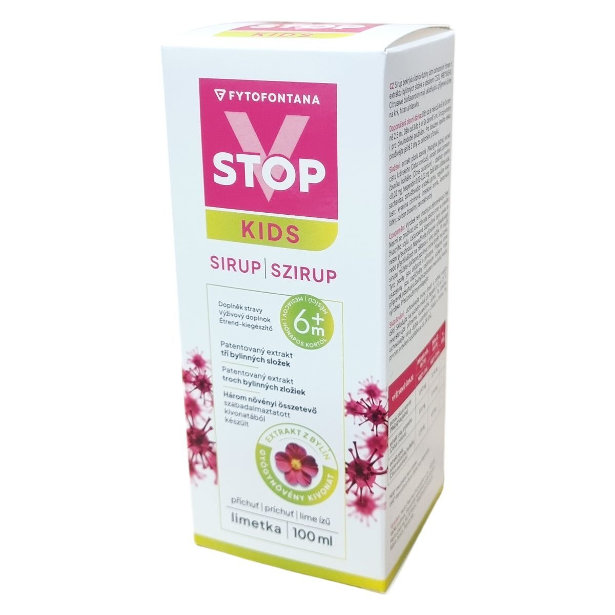 A Fytofontana V Stop Kids szirup három növényi kivonatból, acerola, bodorrózsa (Cistus creticus) és keserű narancs gyümölcs kivonatából áll. A Cistus creticus kivonat védőréteget képezhet a szájüreg nyálkahártyáján, míg a citrusfélék bioflavonoidjai kellemes, nyugtató hatással lehetnek a torok, garat és hangszálak területén. A készítmény lime ízű, tisztított vizet, szacharózt, gumiarabikumot, citromsavat, lime aromát valamint tartósítószereket is tartalmaz, amelyek segíthetik az állag és eltarthatóság megőrzését. A szirup fokozott elővigyázatossággal alkalmazandó terhes és szoptató nők, illetve azok számára, akik allergiásak vagy túlérzékenyek bármely összetevőjére. Használat közben átmeneti enyhe bizsergő érzés előfordulhat, amely természetes. A növényi összetevők miatt előfordulhatnak finom üledékek, melyek nem befolyásolják a termék minőségét. Az adagolás a gyermekek korcsoportja szerint történik, napi 2 vagy 4 adagban, és a kezelést tüneti javulás után célszerű még három napig folytatni a jobb hatékonyság érdekében.