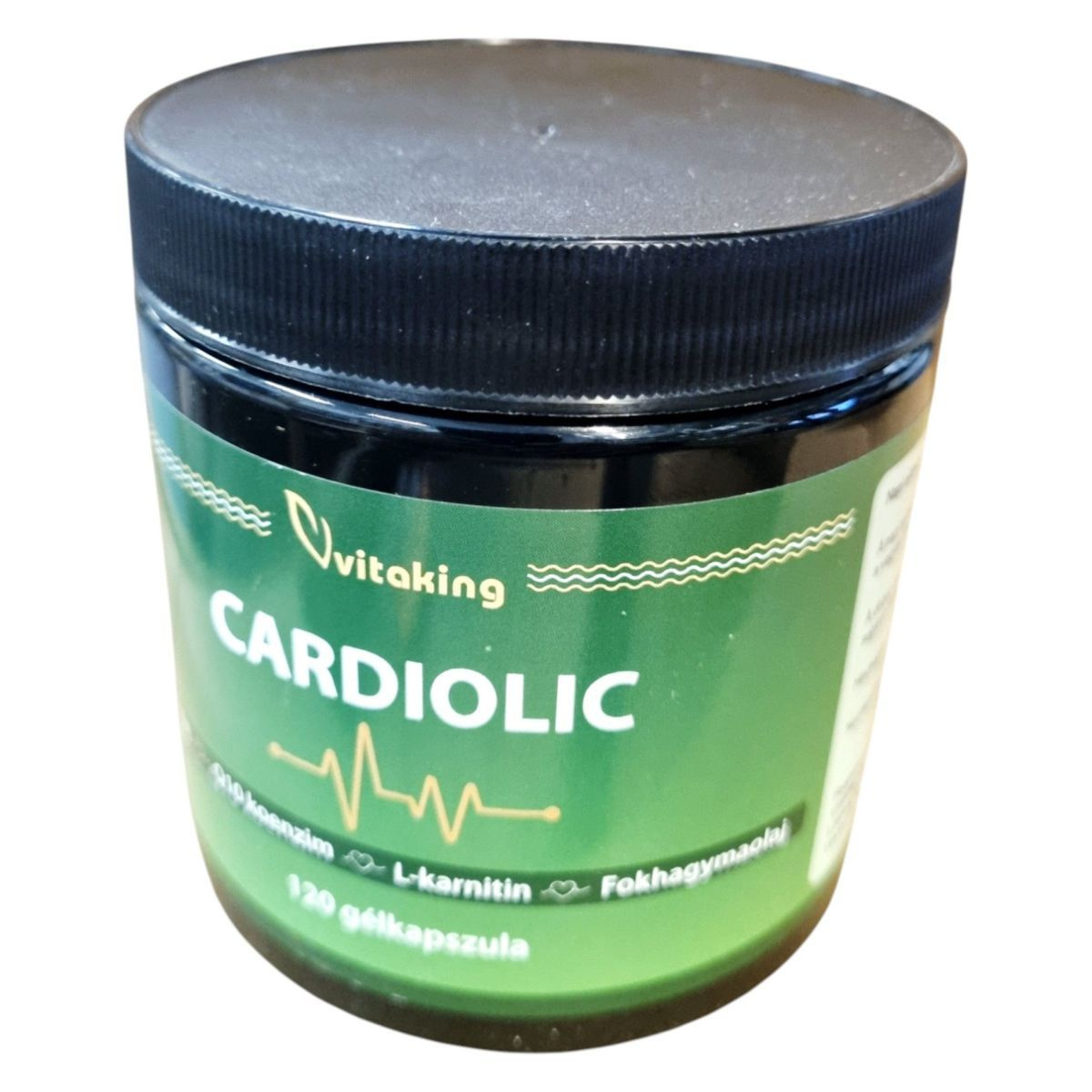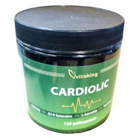 A Vitaking CARDIOLIC étrend-kiegészítő 120 gélkapszulát tartalmaz, amely halolajat, Q10 koenzimet, L-karnitint és fokhagymakivonatot tartalmaz. Az EPA és a DHA hozzájárulhat a szív megfelelő működéséhez, míg a DHA a normál agyi funkció fenntartásához. A termék segíthet fenntartani a normál koleszterinszintet, a szív és az erek egészségét. A kedvező hatás 250 mg EPA és DHA napi bevitelével érhető el. A termék használata során fontos, hogy a napi ajánlott mennyiséget ne lépje túl, és a terméket gyermekek elől elzárva, száraz, hűvös helyen tárolja.