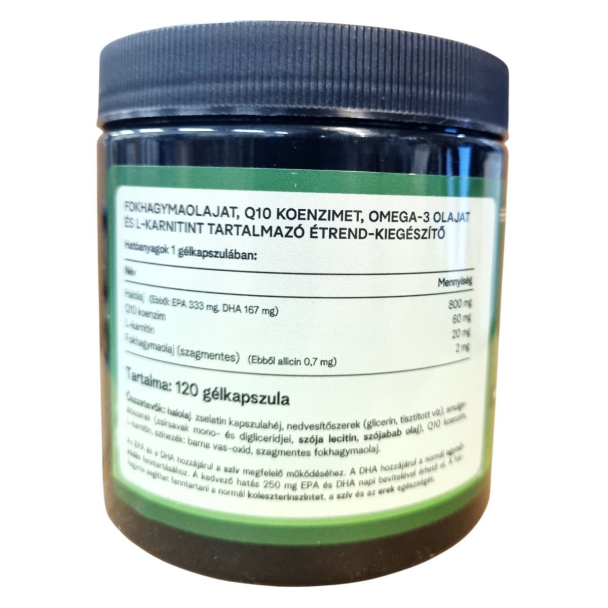 Halolaj, zselatin kapszulahéj, nedvesítőszer (glicerin, tisztított víz), emulgeálószer (szójaolaj mono- és digliceridjei, szója lecitin, szójaolaj), Q10 koenzim, L-karnitin, színezék: barna vas-oxid, szagmentes fokhagymaolaj.