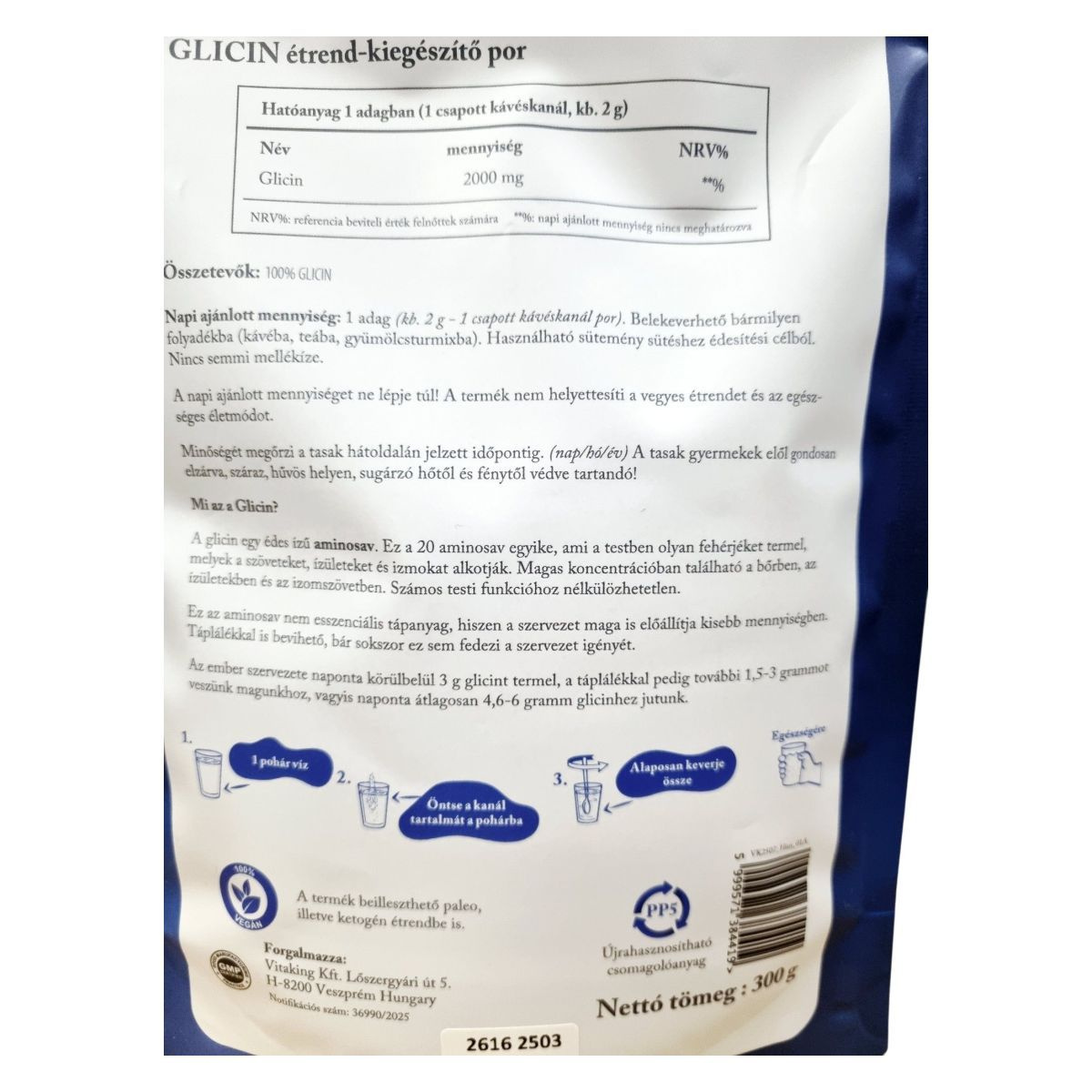 A glicin az egyik legkisebb és legegyszerűbb aminosav, amely kulcsszerepet játszik a szervezet fehérjeépítő folyamataiban. Segíthet a sejtek regenerációjában, a bőr, az ízületek és az izmok egészségének fenntartásában, valamint hozzájárulhat az idegrendszer kiegyensúlyozott működéséhez. Magas tisztaságú, íztelen por formája révén egyszerűen beilleszthető a mindennapi étrendbe. Természetes, vegán összetételének köszönhetően paleo és ketogén életmódot követők számára is ideális választás.