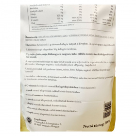 Hidrolizált kollagén (marha kollagén), L-aszkorbinsav, citromsav, aroma, édesítőszer: szteviol-glikozid, cink citrát, színezék: kurkuma