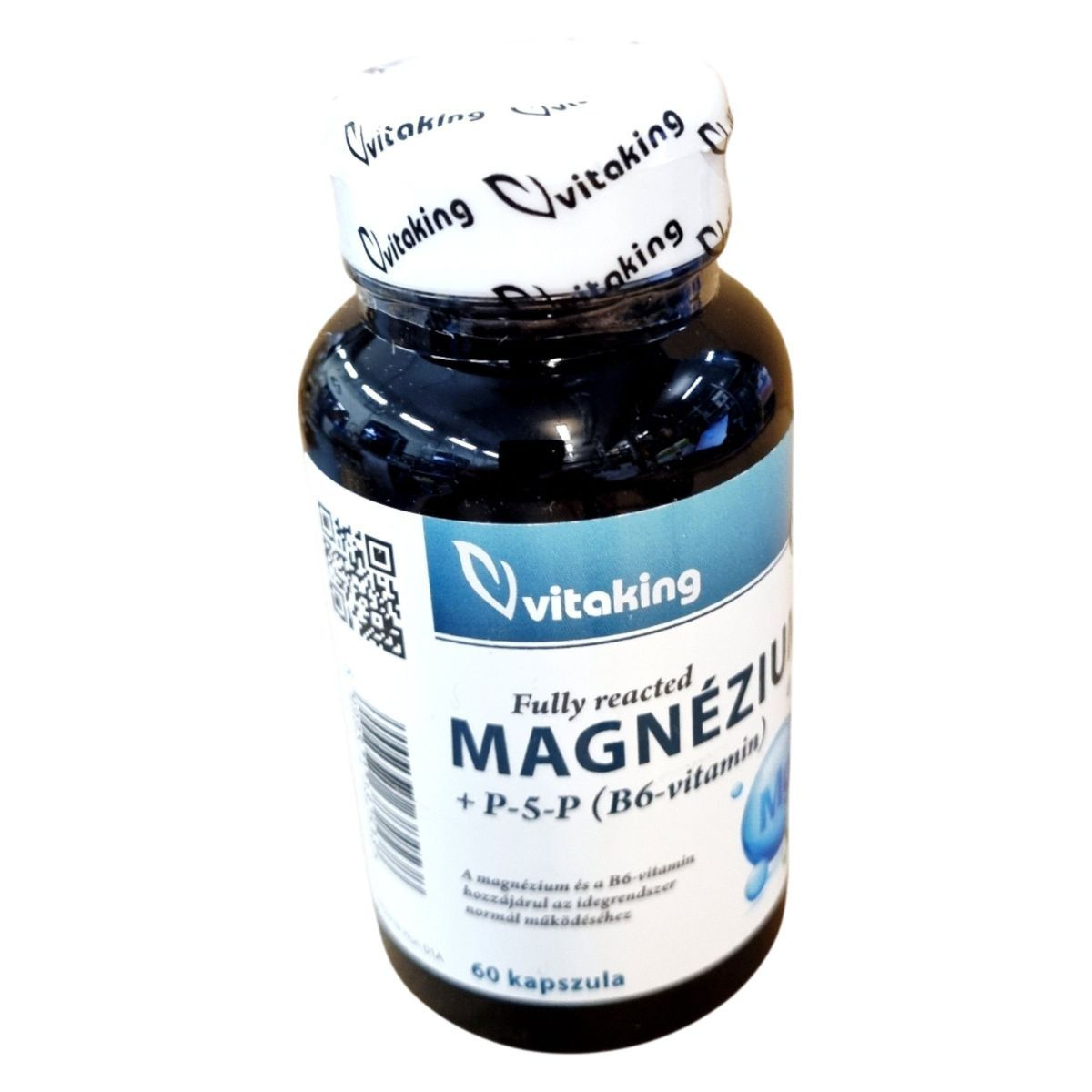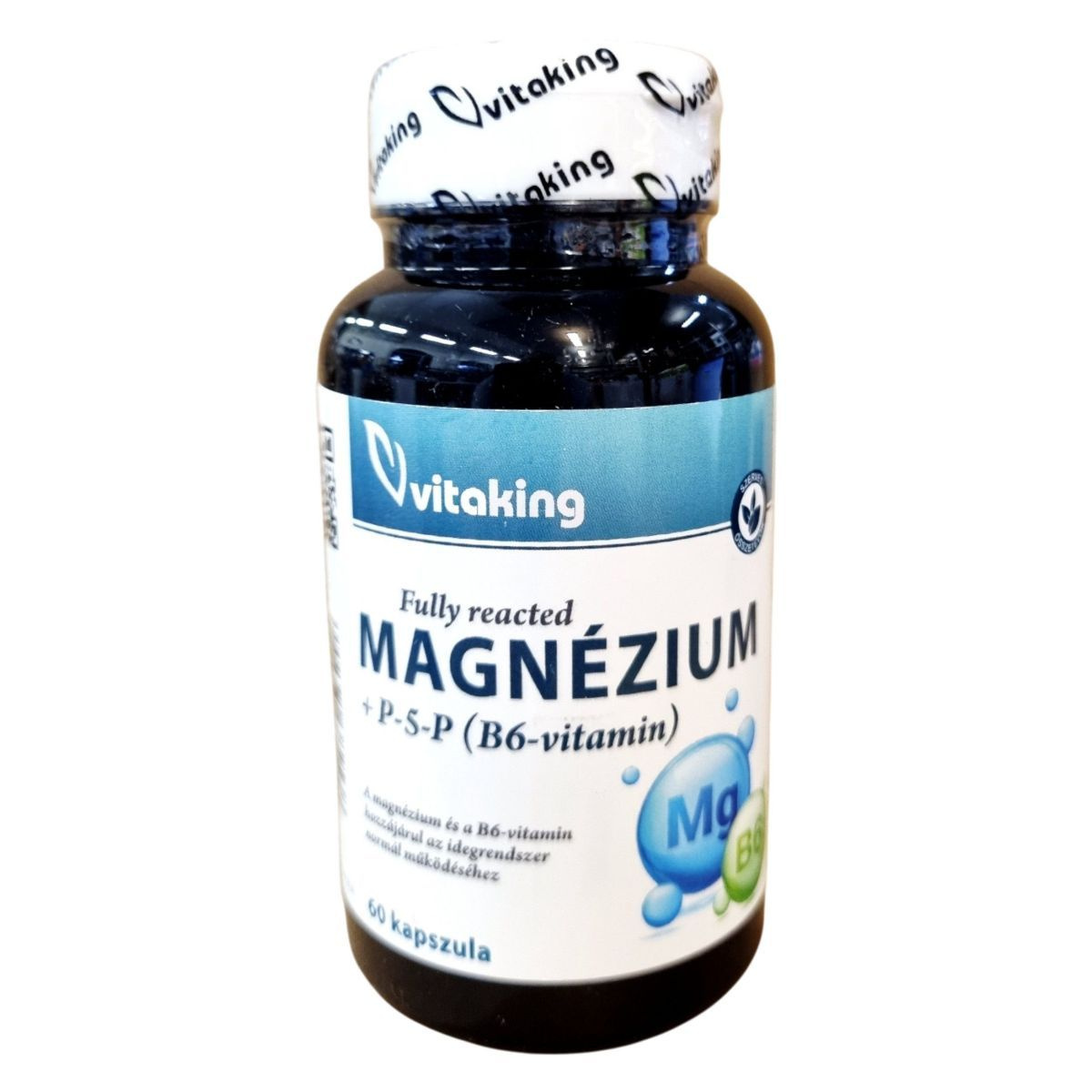 A Vitaking Fully reacted MAGNÉZIUM + P-5-P (B6-vitamin) étrend-kiegészítő 60 kapszulás kiszerelésben kapható. A termék magnézium-biszglicinátot és piridoxál-5'-foszfátot tartalmaz, amelyek hozzájárulhatnak az idegrendszer normál működéséhez és a pszichológiai funkciók fenntartásához. A B6-vitamin segíthet a fáradtság és a kifáradás csökkentésében. A termék használata során fontos betartani az ajánlott napi mennyiséget, és nem helyettesíti a vegyes étrendet vagy az egészséges életmódot. Tárolása száraz, hűvös helyen javasolt, gyermekektől elzárva.