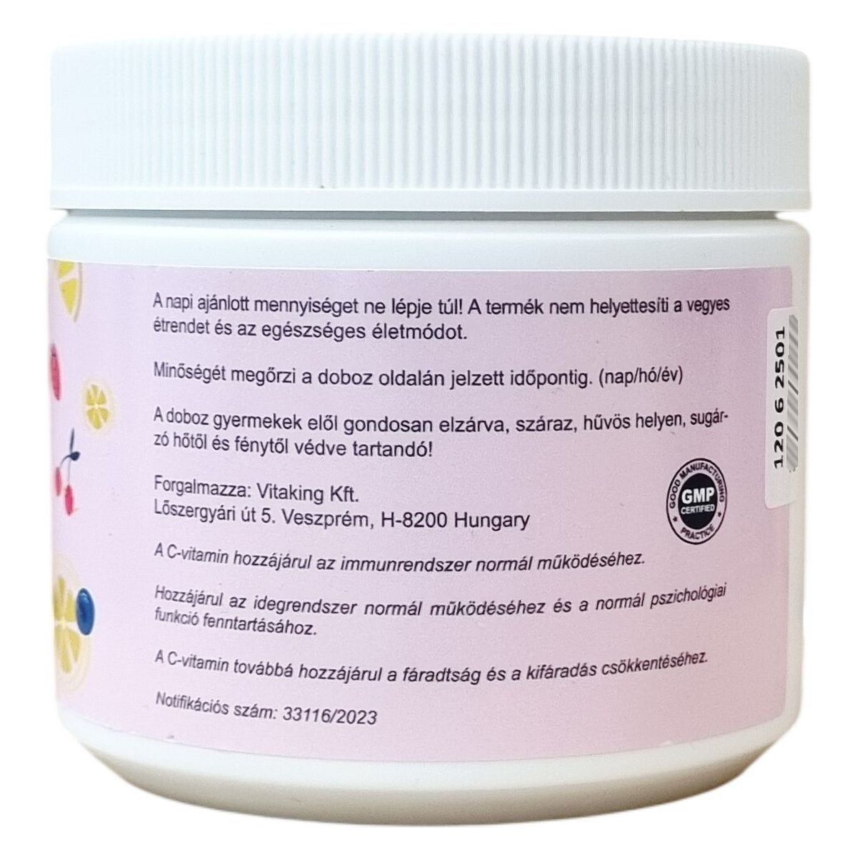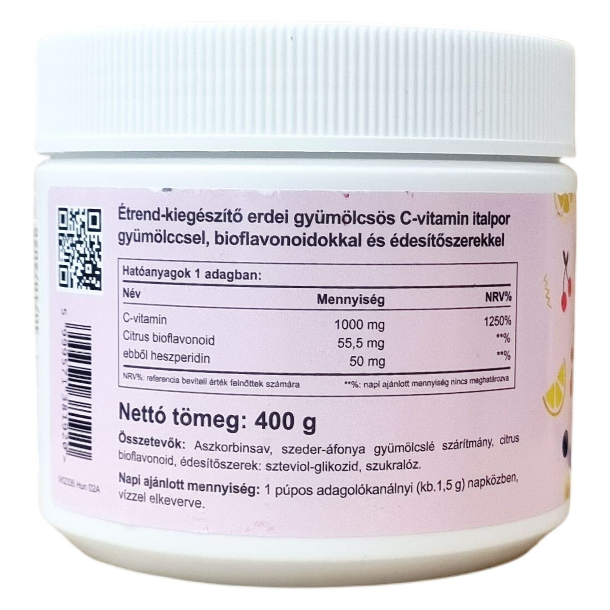 Ez az étrend-kiegészítő italpor C-vitamint, citrus bioflavonoidokat, valamint természetes erdei gyümölcsös ízt tartalmaz. A termék az aszkorbinsav mellett szeder-áfonya gyümölcslé szárítmányt és természetes édesítőszereket, például szteviol-glikozidot és szukralózt tartalmaz. A C-vitamin fontos szerepet játszhat az immunrendszer, az idegrendszer és a pszichológiai funkciók támogatásában, továbbá segítheti a fáradtság és kifáradás csökkentését. A termék adagolása egyszerű, a javasolt napi adagolókanálnyi por vízzel elkeverve fogyasztandó. A csomagot gyermekektől elzárva, száraz, hűvös és fénytől védett helyen ajánlott tárolni.