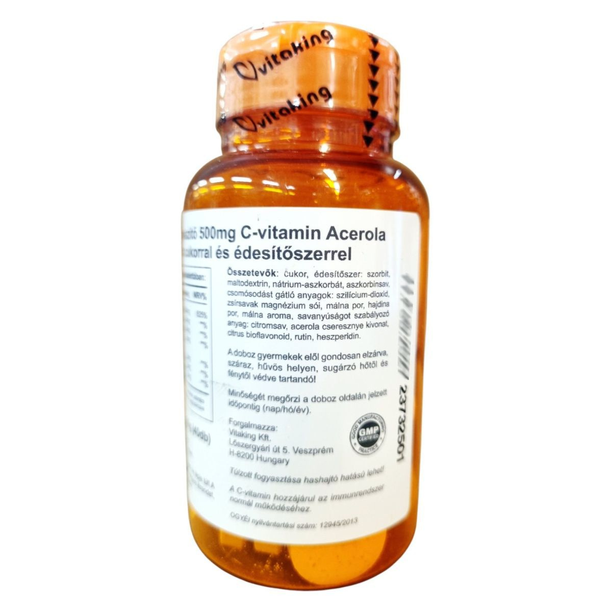 A Vitaking ACEROLA C-500 rágótabletta 500 mg C-vitamint tartalmaz, amely hozzájárulhat az immunrendszer normál működéséhez. A termék málna ízesítéssel készült, és további összetevői között megtalálható a málna por, hajdina por, acerola cseresznye kivonat, citrus bioflavonoid, rutin és heszperidin. A termék cukorral és édesítőszerrel készült, és figyelmeztetést tartalmaz a túlzott fogyasztás hashajtó hatásáról. A termék tárolása száraz, hűvös helyen javasolt, gyermekek elől elzárva.