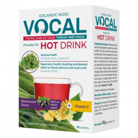A VOCAL Feketeribizli ízű forró italpora Izlandi zuzmó, hársfavirág-, gyömbér-, ökörfarkkóró-, bodzavirágkivonatot és C-vitamint is tartalmaz.