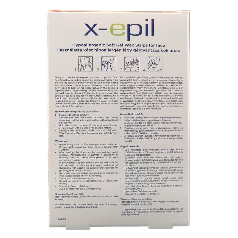 Speciális gél állagának köszönhetően még egyszerűbbé és gyorsabbá teszi a szőrtelenítést a bajusz, és az áll területein. Bárhol, bármikor használható, mert a gyantacsíkok szétválasztásához nem kell azokat összedörzsölni vagy melegíteni. Gyantázás után a bőr selymesen lágy és kellemes gyümölcsös illatú lesz. Az X-Epil Gyantázás utáni olajos törlőkendő segít a bőrön maradt gyantamaradékok eltávolításában, összetevői pedig megnyugtatják a bőrt.