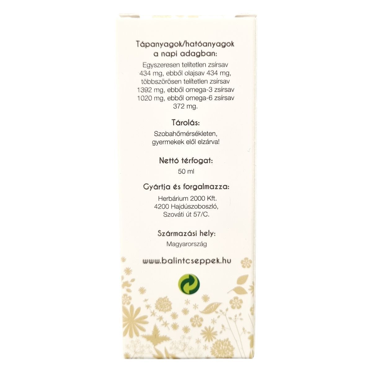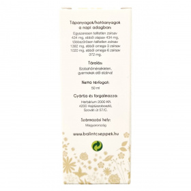 A termék 100%-os hidegen sajtolt lenmagolaj, amely Magyarországon készül. A készítmény több mint 50%-ban tartalmaz többszörösen telítetlen zsírsavakat, különösen omega-3 és omega-6 zsírsavakat, valamint egyszeresen telítetlen zsírsavakat, főként olajsavat. A lenmagolaj 50 ml-es kiszerelésben érhető el. A termék csomagolásán szerepel a vonalkód és az OGYÉI engedélyszám is. Ez az étrend-kiegészítő természetes zsírsavforrásként szolgálhat, mely hozzájárulhat az egészséges étrend kiegészítéséhez.