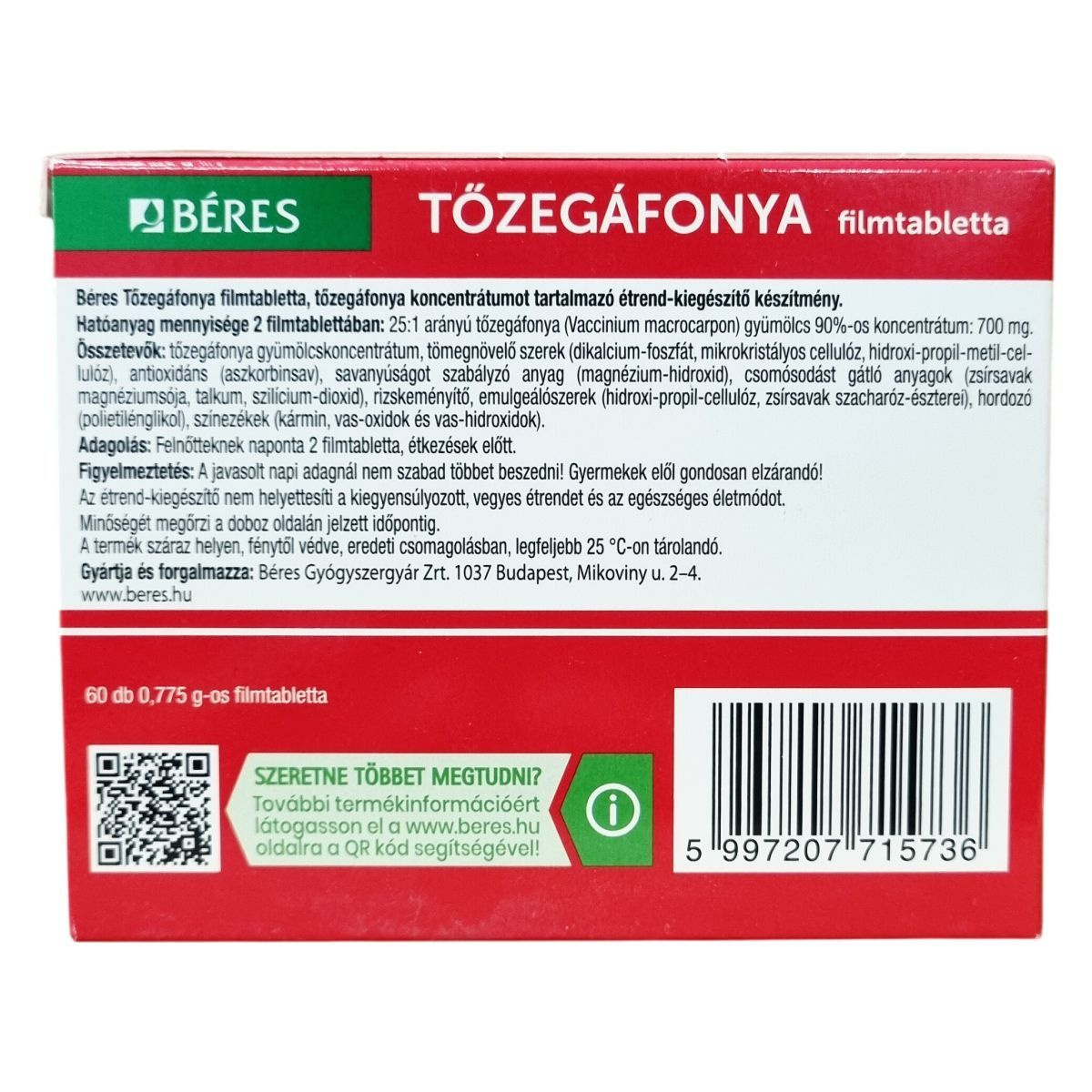 A Béres Tőzegáfonya filmtabletta két filmtablettában 700 mg, 25:1 arányú tőzegáfonya gyümölcs 90%-os koncentrátumot tartalmaz. Az összetevők között megtalálhatók különböző tömegnövelő szerek, antioxidáns, savanyúságot szabályzó anyag, csomósodást gátló anyagok, rizskeményítő, emulgeálószerek, hordozó és színezékek. A készítmény 60 db 0,775 g-os filmtablettából áll. Ez az étrend-kiegészítő hozzájárulhat a szervezet egészségének támogatásához, azonban nem helyettesíti a kiegyensúlyozott táplálkozást és egészséges életmódot. A terméket gyermekek elől elzárva, a javasolt adagolás betartásával célszerű alkalmazni.