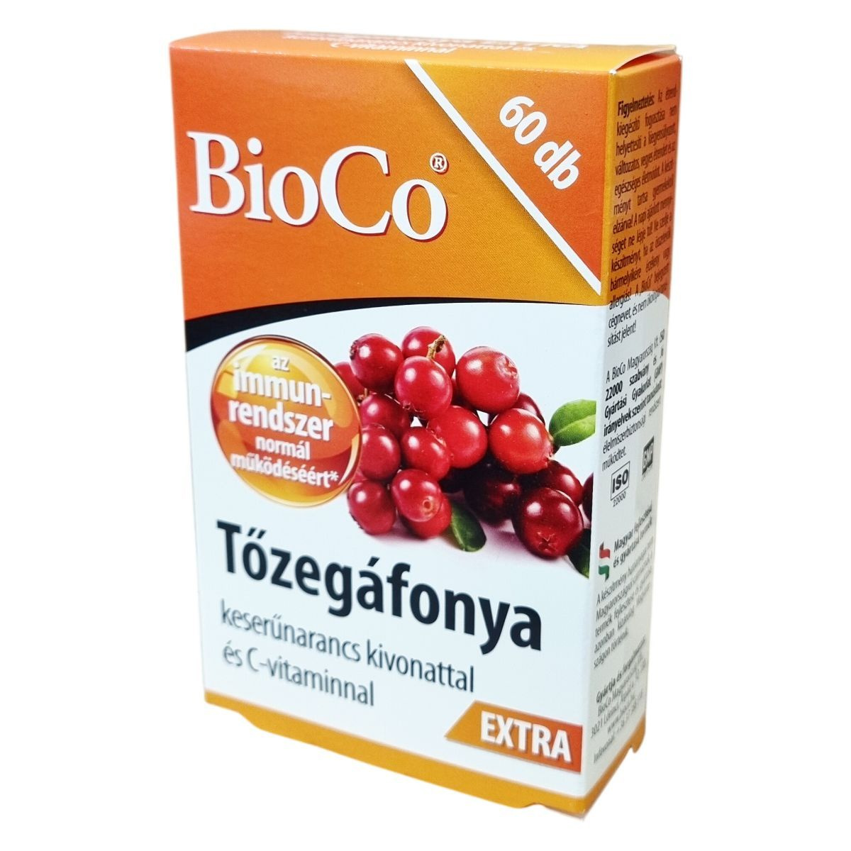 A BioCo® Tőzegáfonya EXTRA egy olyan étrend-kiegészítő tabletta, amely tőzegáfonya és keserűnarancs kivonatot, továbbá C-vitamint tartalmaz. A készítményben lévő tőzegáfonya kivonat magas dózisban van jelen, amely körülbelül 5000 mg szárított tőzegáfonya növényi őrleménynek felel meg tablettánként. A keserűnarancs kivonatból nyert bioflavonoidok, különösen a heszperidin, valamint a C-vitamin kiegészítik a készítményt. A C-vitamin hozzájárulhat az ideg- és immunrendszer normál működéséhez, a sejtek oxidatív stresszel szembeni védelméhez, illetve a fáradtság és kifáradás csökkentéséhez. A termék kizárólag Magyarországon került kifejlesztésre és előállításra, bár hatóanyagai nem magyarországi származásúak. A BioCo Magyarország Kft. rendelkezik ISO 22000 szabvány szerinti és Jó Gyártási Gyakorlat (GMP) irányelveket követő élelmiszerbiztonsági tanúsítással, amely garantálja a magas minőséget és biztonságot. Figyelni kell arra, hogy a termék nem helyettesíti a kiegyensúlyozott étrendet, és a napi ajánlott mennyiséget nem szabad túllépni.