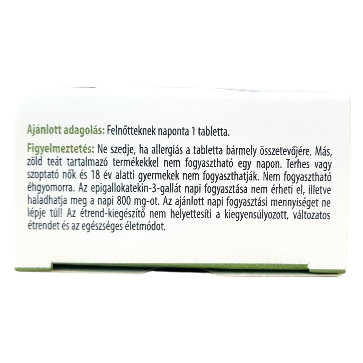 Ne szedje, ha allergiás a tabletta bármely összetevőjére. Más, zöld teát tartalmazó termékekkel nem fogyasztható egy napon. Terhes vagy szoptató nők és 18 év alatti gyermekek nem fogyaszthatják. Nem fogyasztható éhgyomorra. Az epigallokatekin-3-gallát napi fogyasztása nem érheti el, illetve haladhatja meg a napi 800 mg-ot. Az ajánlott napi fogyasztási mennyiséget ne lépje túl. Az étrend-kiegészítő nem helyettesíti a kiegyensúlyozott, változatos étrendet és az egészséges életmódot.