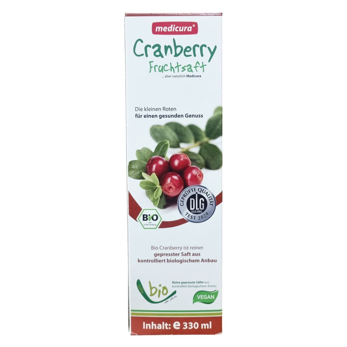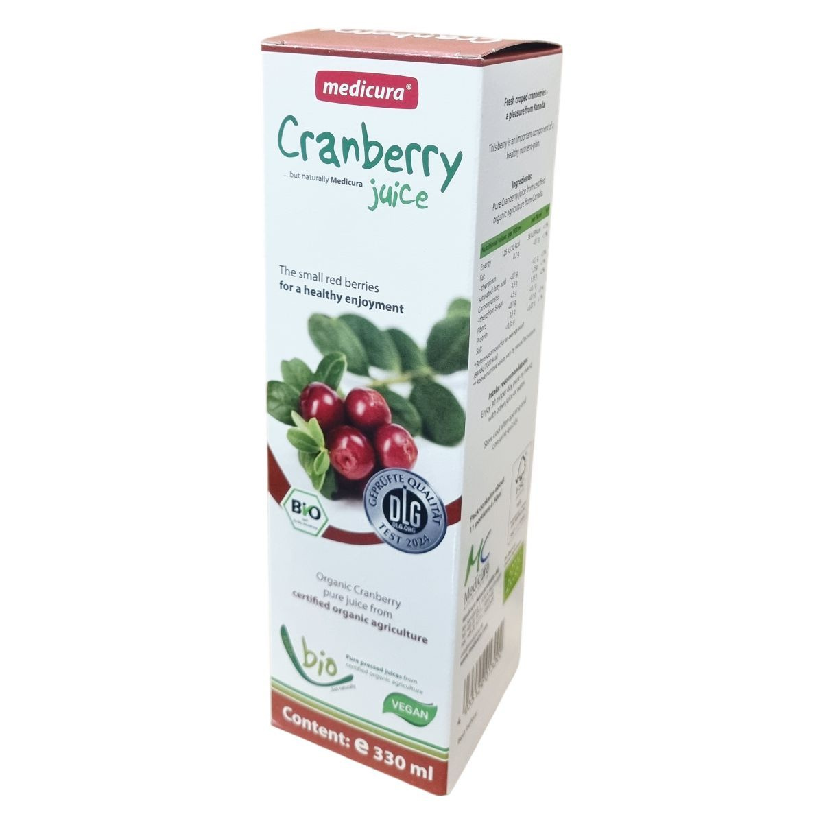 A medicura® Cranberry tiszta, préselt tőzegáfonya levet tartalmaz, amely ellenőrzött biogazdálkodásból származik és Kanadából származó friss termésből készül. A tőzegáfonya fontos része egy egészséges étrendnek, a termék vegán és bio minősítésű. A csomagolás FSC tanúsítvánnyal rendelkezik, támogatva a fenntartható erdőgazdálkodást. A palack tartalma körülbelül 11 adag 30 ml-enként.