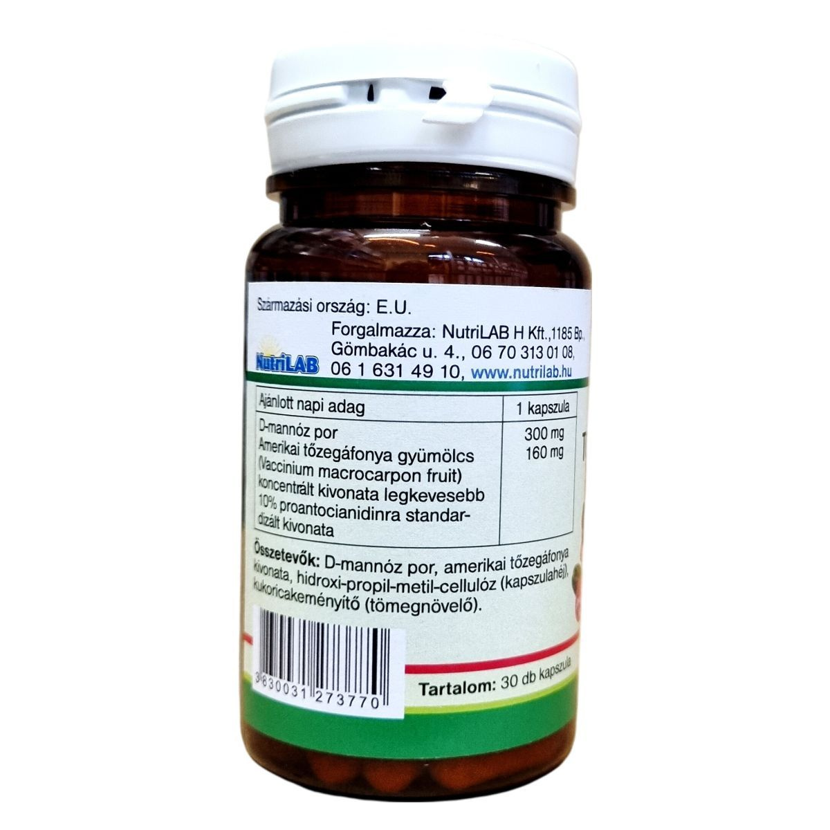 Az amerikai tőzegáfonya és D-mannóz kombinációját tartalmazó étrend-kiegészítő kapszula hozzájárulhat a húgyúti rendszer egészségének támogatásához. A termék 10% proantocianidinra standardizált, és vegetáriánusok számára is alkalmas növényi kapszulában kapható. Az étrend-kiegészítő nem helyettesíti a kiegyensúlyozott és változatos étrendet. A termék származási országa az EU, és a NutriLAB H Kft. forgalmazza.