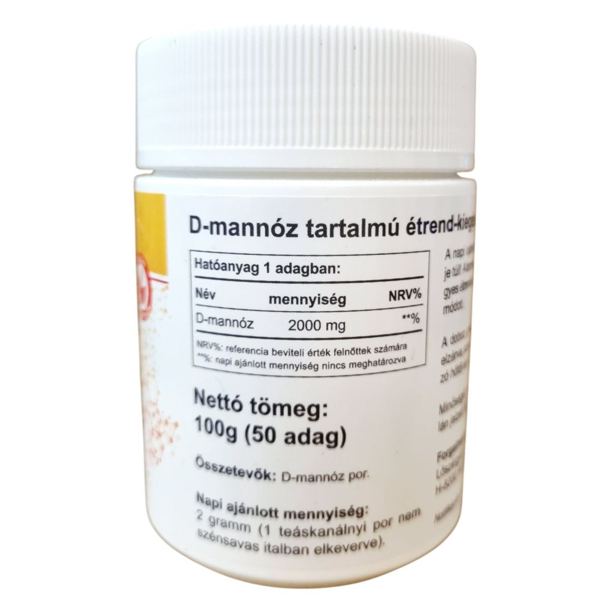 A D-mannóz egy természetes előfordulású, egyszerű cukor (monoszacharid), amely szerkezetileg a glükózhoz hasonló, de eltérő anyagcsereúton hasznosul. A szervezetben csak részben metabolizálódik, jelentős része változatlan formában kiválasztódik a vizelettel, ahol képes lehet kötődni bizonyos baktériumok – például az Escherichia coli – felszíni adhéziós struktúráihoz. Ez a mechanizmus hozzájárulhat ahhoz, hogy a baktériumok ne tapadjanak meg a húgyúti hámsejteken. Elsősorban a húgyúti komfort támogatására alkalmazzák. Megfelelő adagolás mellett általában jól tolerálható, azonban nagyobb mennyiségben emésztőrendszeri panaszokat okozhat. Egyéni egészségügyi állapot vagy gyógyszerszedés esetén javasolt szakemberrel konzultálni.