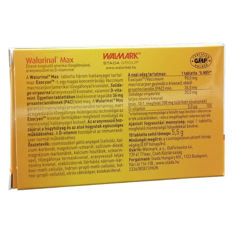 Az új, továbbfejlesztett Walurinal Max az amerikai tőzegáfonya mellett aranyvessző-kivonatot (Solidago virgaurea) és D-vitamint tartalmaz a húgyutak egészségéért, a szervezet védekezőképességéért. A CystiCran tőzegáfonya-kivonatnak köszönhetően egy tabletta 423 000 mg természetes tőzegáfonyának megfelelő kivonatot tartalmaz. A napi adagban 36 mg proantocianidin (PAC) van. Az aranyvessző hozzájárul a húgyutak egészségéhez, a D-vitamin a szervezet megfelelő védekező képességéhez. A Walurinal Max összetételét a P1100358 számú szabadalmi bejelentés védi.